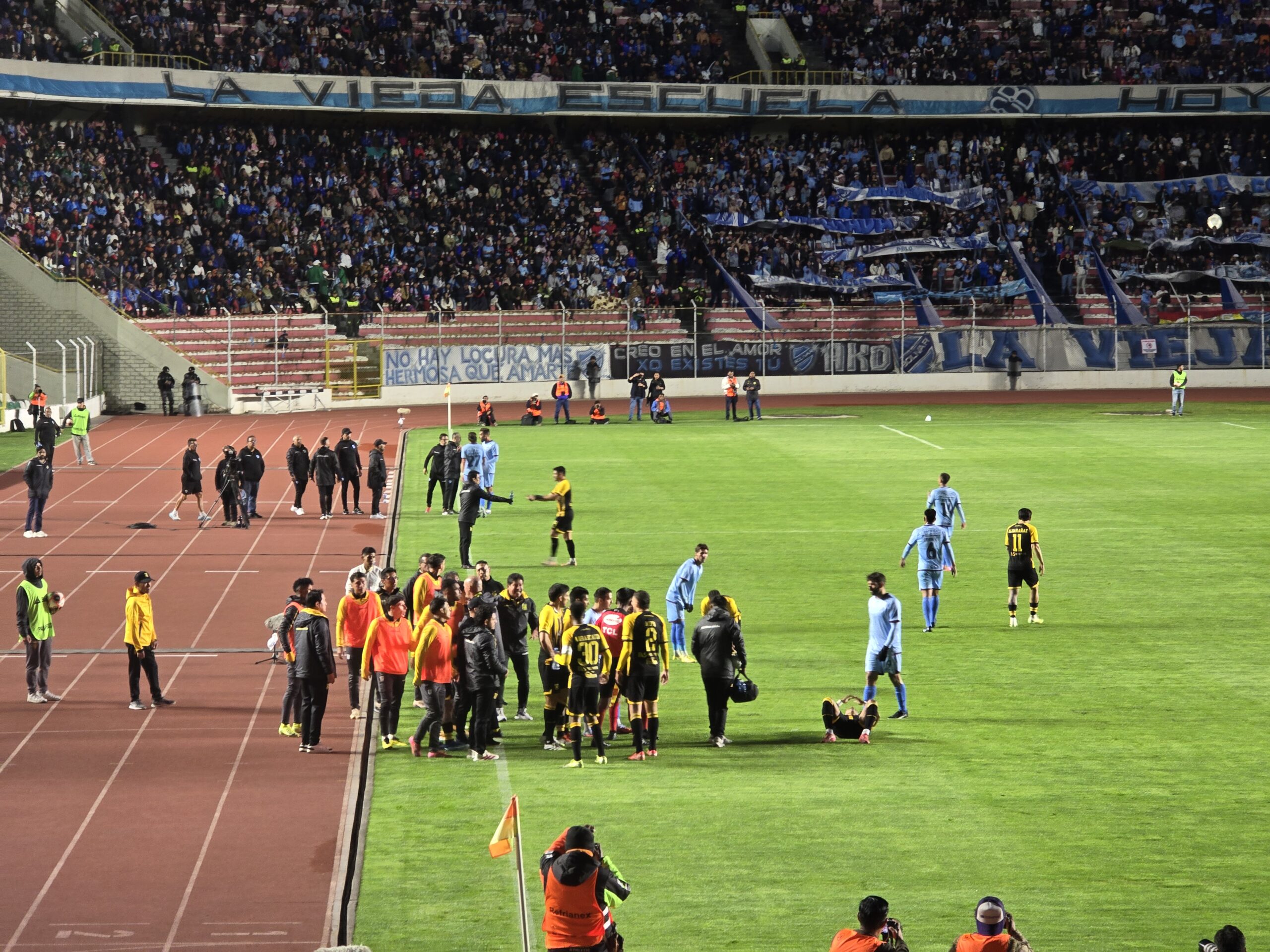 Nachdem Vormittags wieder der Sprachkurs angestanden hatte, ging es heute Nachmittag zu einem Fußballspiel. Diese Tour wurde vom Hostel organisiert. Es spielten The Strongest (ja, der Verein heißt wirklich seit über 100 Jahren so) gegen Bolivar. Wir waren für The Strongest, da das der Club von dem Hostel Staff ist, der die Tour organisiert hat.