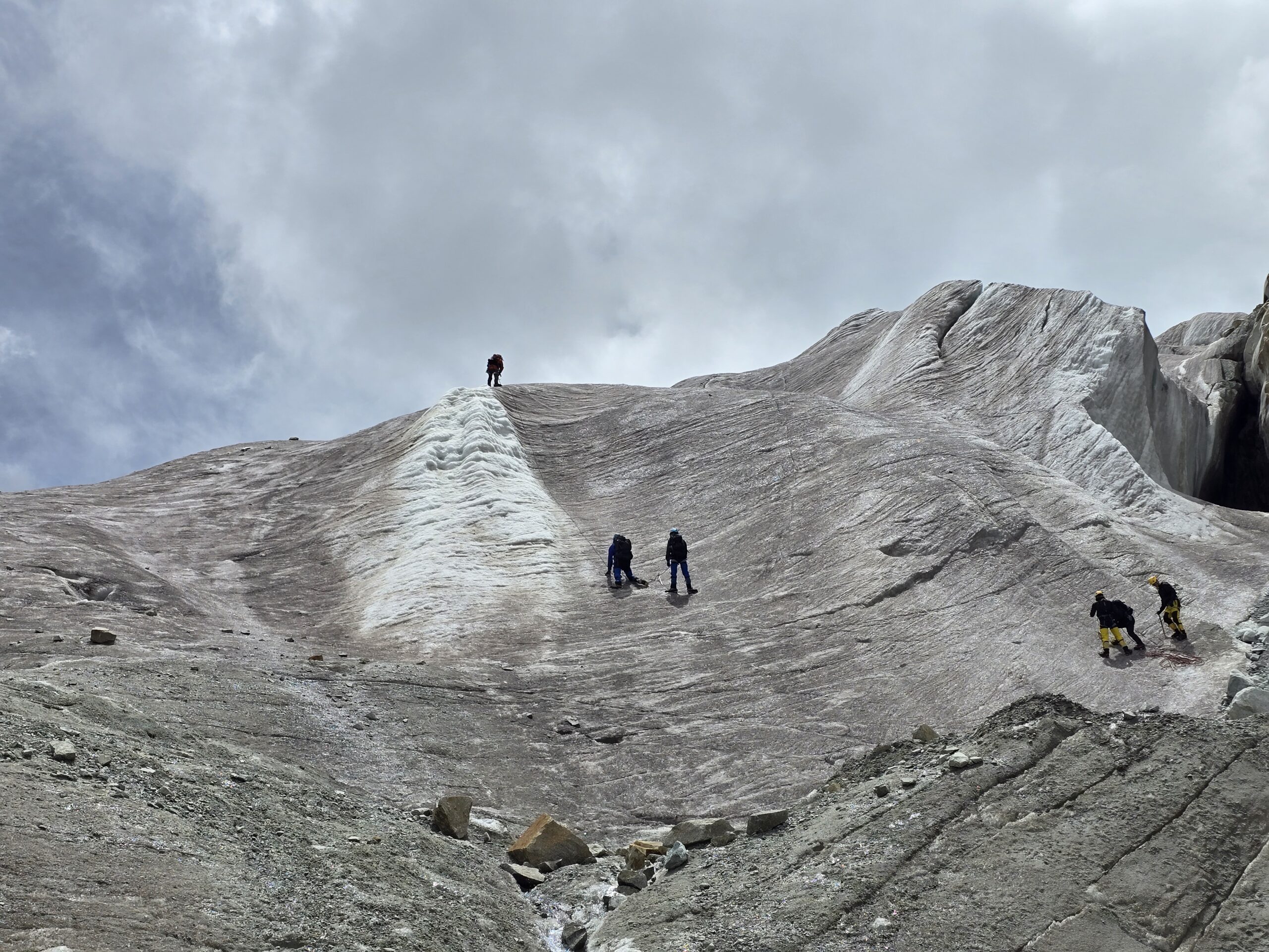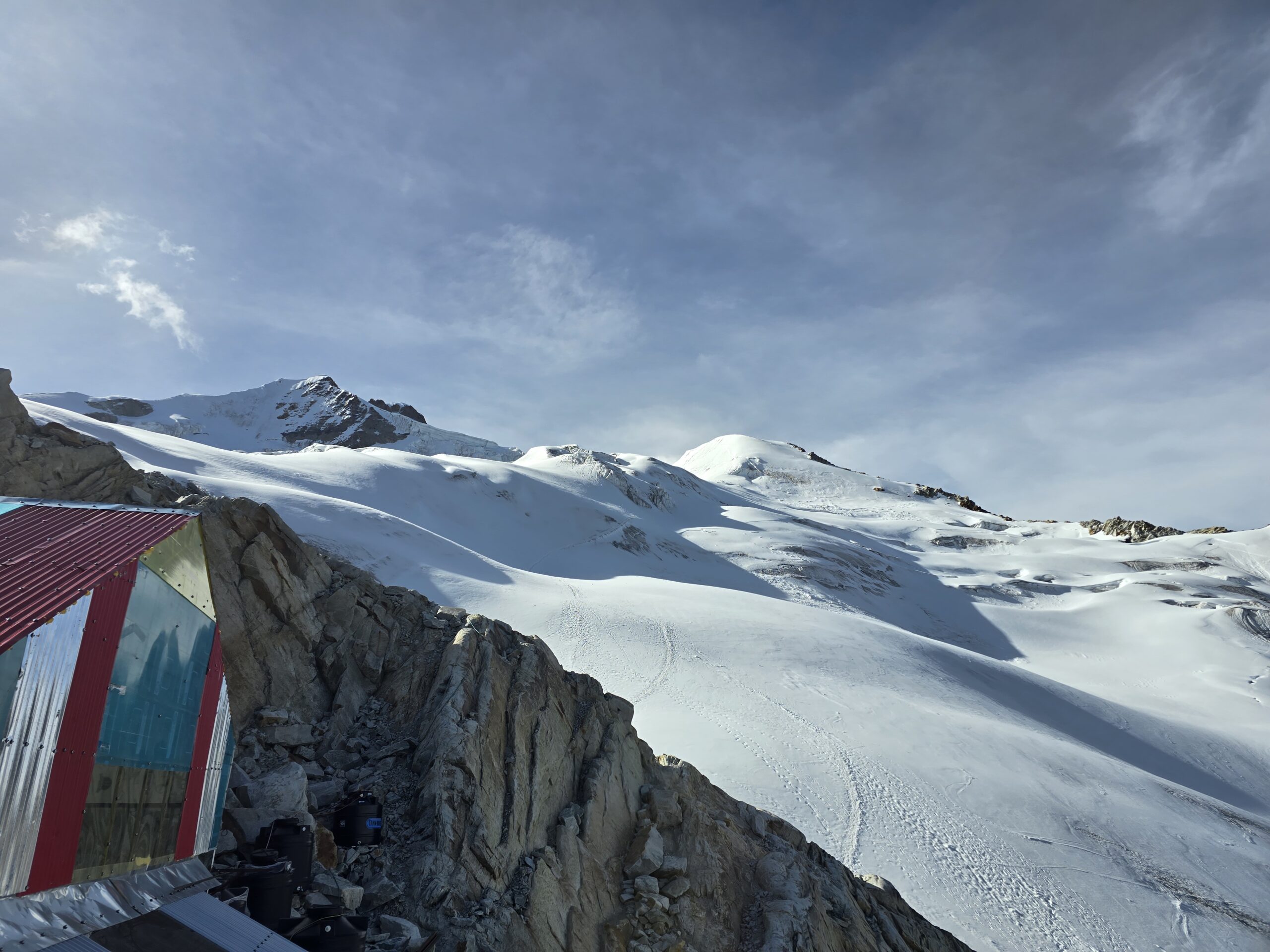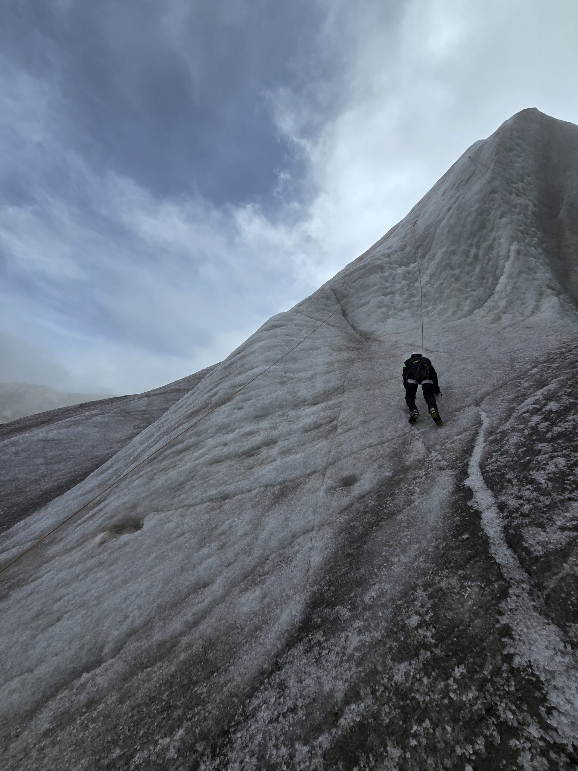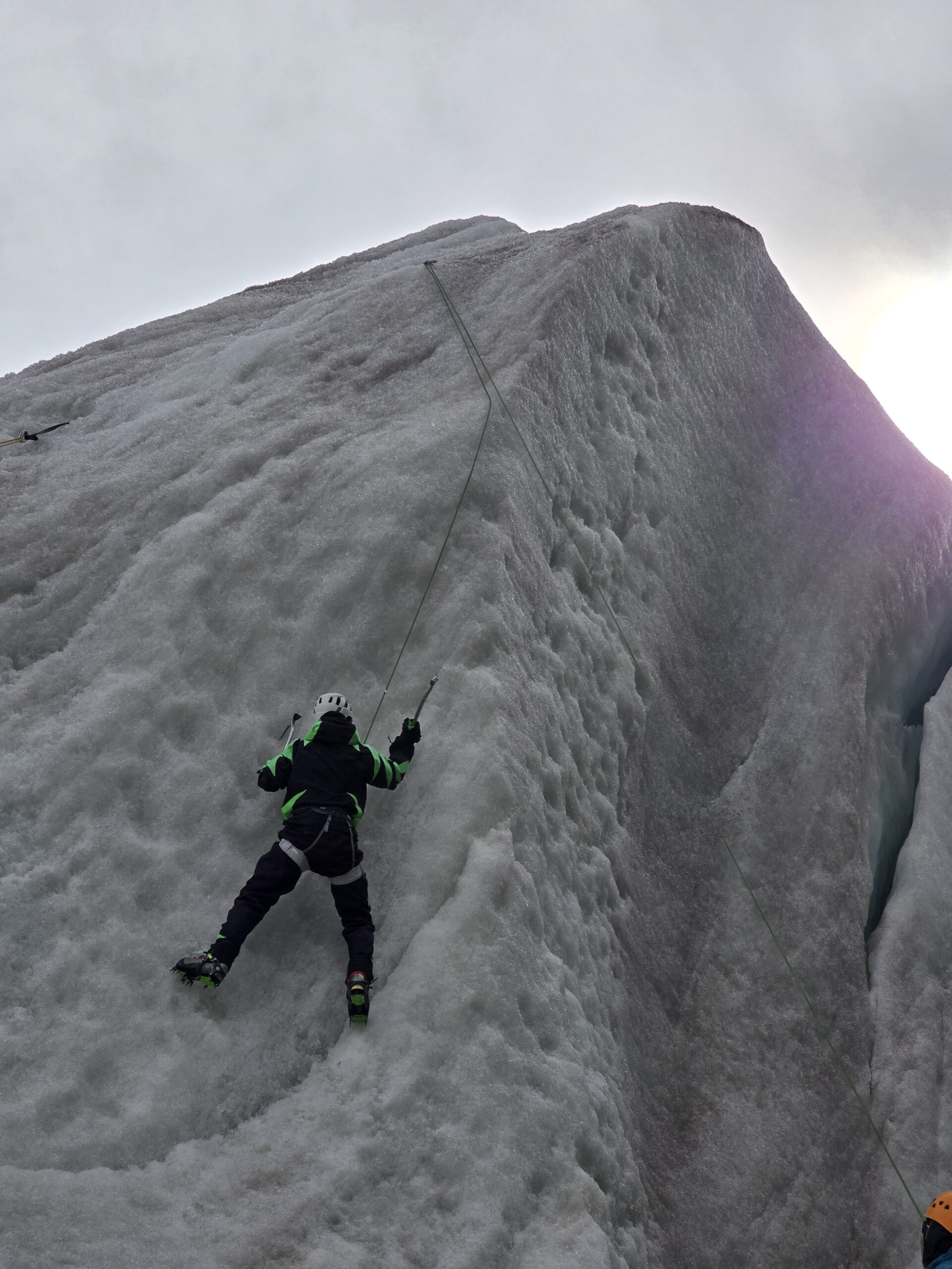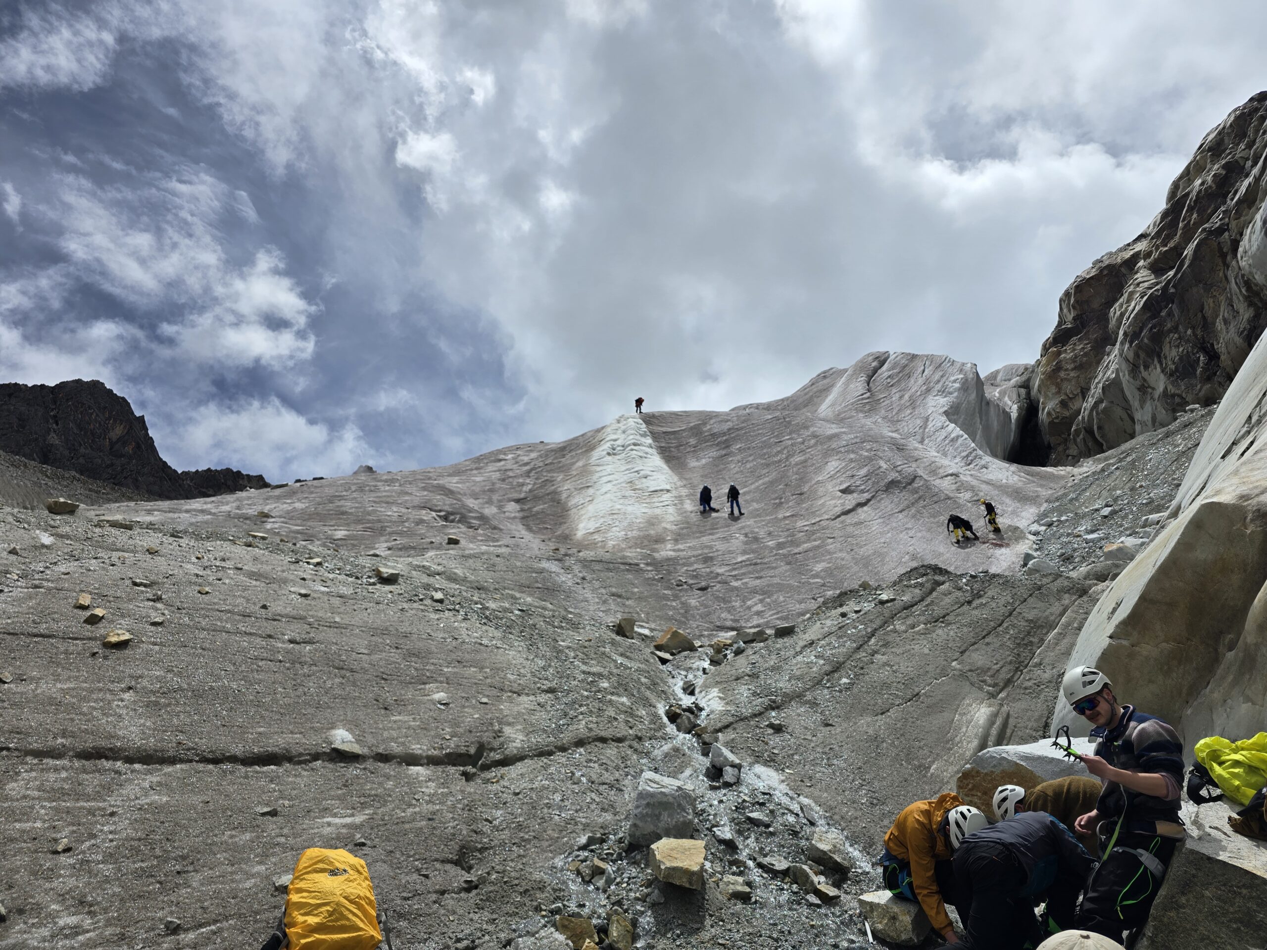 Angekommen wurden als Erstes die Betten bezogen, es gab Mittagessen und danach ging es los zum Gletscher auf eine Trainingsrunde. Denn um diesen Berg besteigen zu können, musste man Steigeisen und Eispickel nutzen und das sollte vorher einmal ausprobiert werden. Also wurden einmal die verschiedenen Schritte ausprobiert, die man an verschieden steilen Stellen nutzt und danach ging es ans Eisklettern. Die Route, die ich geklettert bin, hatte einen kleinen Überhang und man hatte kaum halt mit den Füßen. Die ganze Sache war auch maximal anstrengend, da wir uns ja über 5000m befunden haben.
