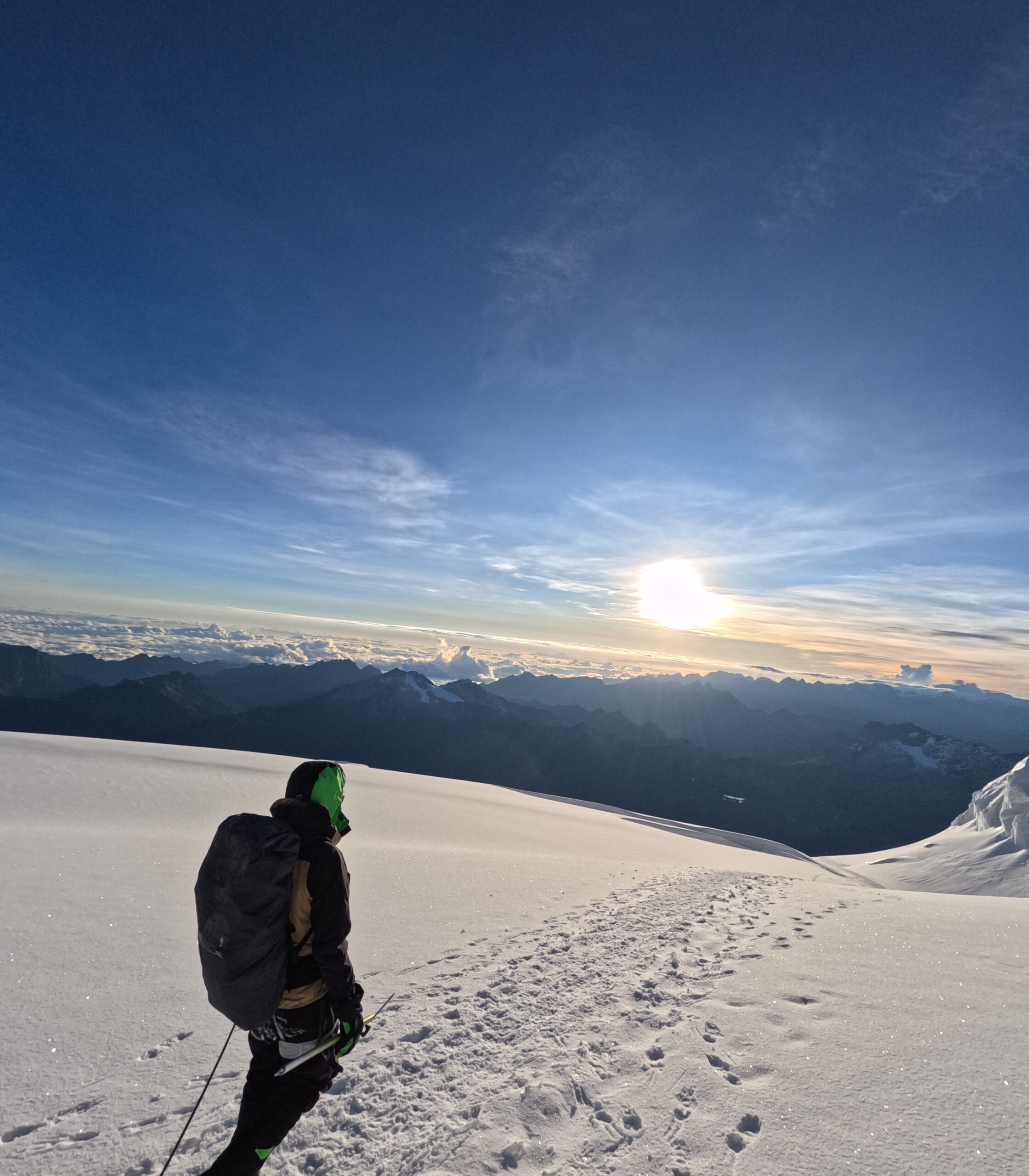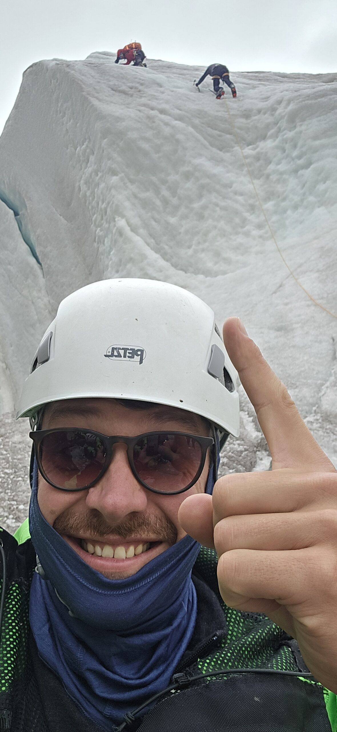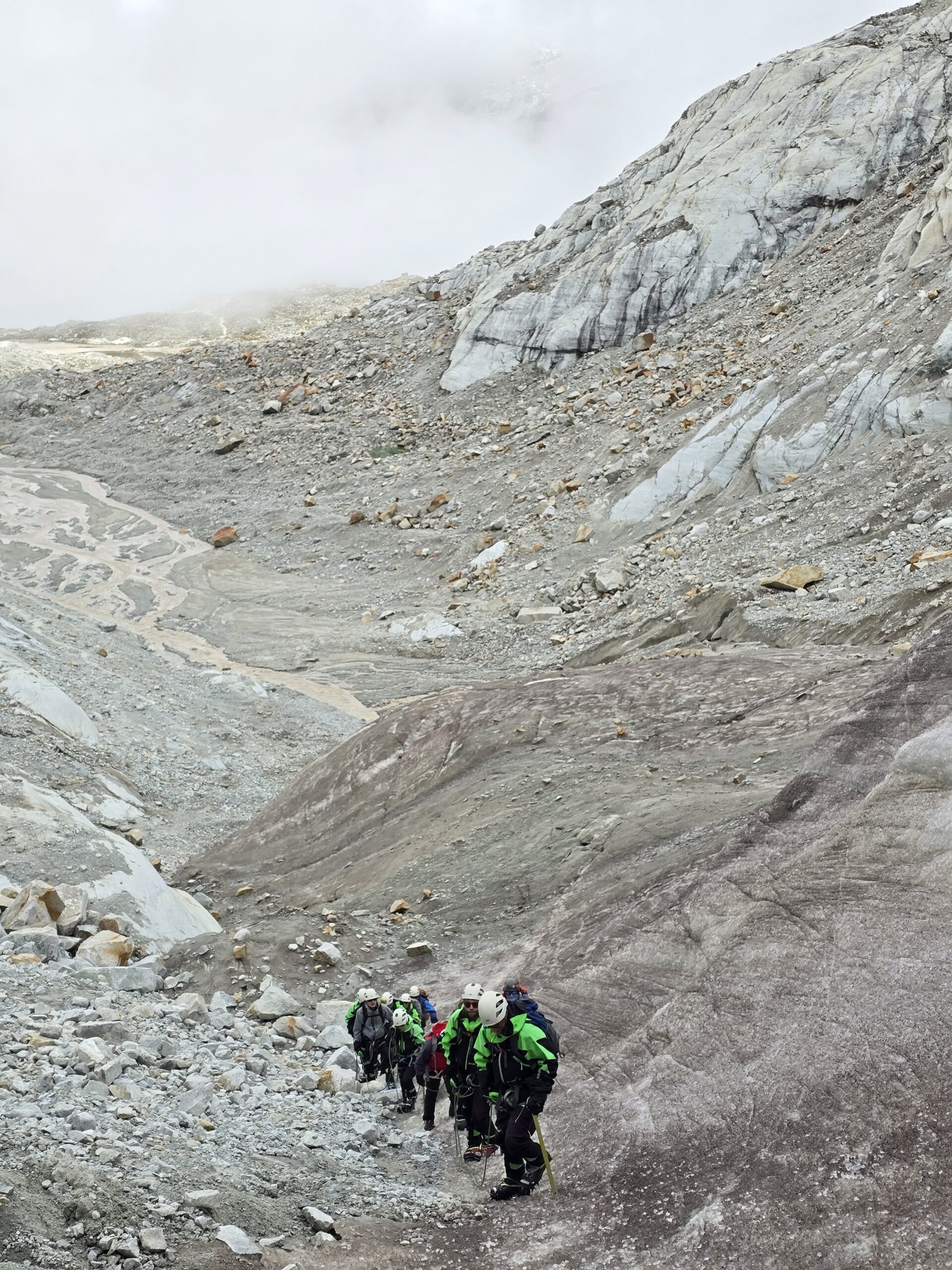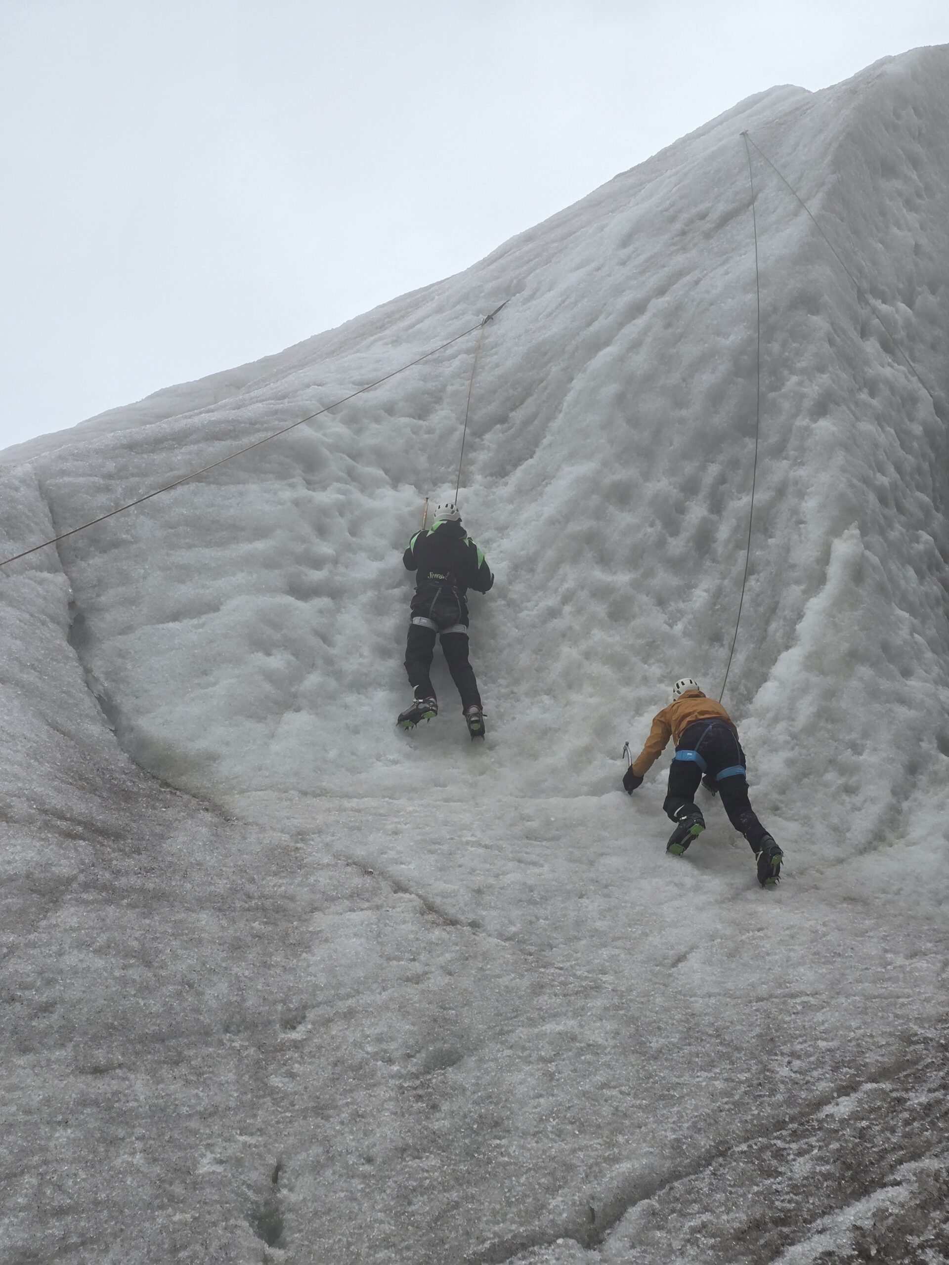 Angekommen wurden als Erstes die Betten bezogen, es gab Mittagessen und danach ging es los zum Gletscher auf eine Trainingsrunde. Denn um diesen Berg besteigen zu können, musste man Steigeisen und Eispickel nutzen und das sollte vorher einmal ausprobiert werden. Also wurden einmal die verschiedenen Schritte ausprobiert, die man an verschieden steilen Stellen nutzt und danach ging es ans Eisklettern. Die Route, die ich geklettert bin, hatte einen kleinen Überhang und man hatte kaum halt mit den Füßen. Die ganze Sache war auch maximal anstrengend, da wir uns ja über 5000m befunden haben.