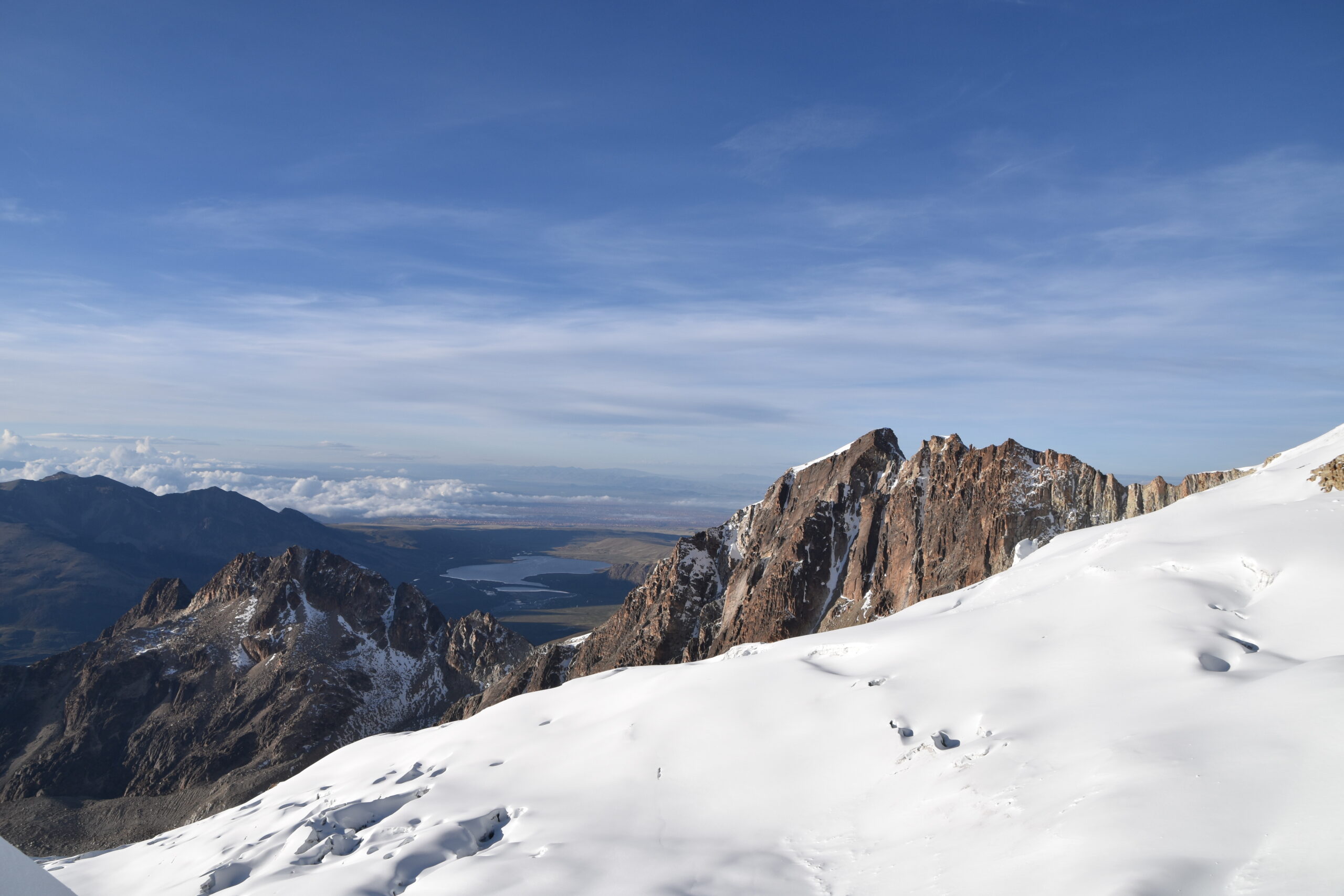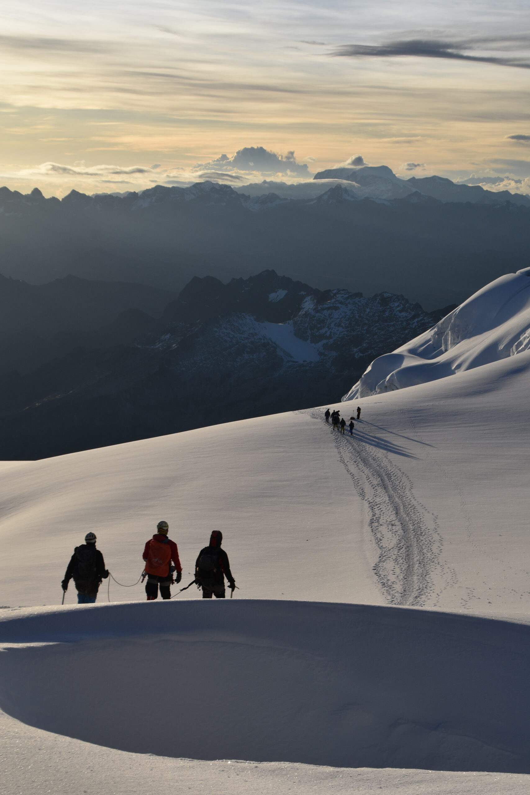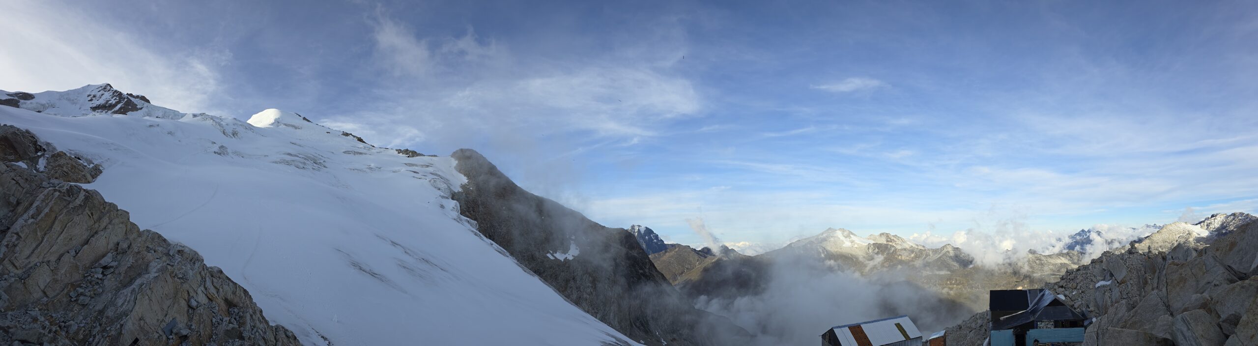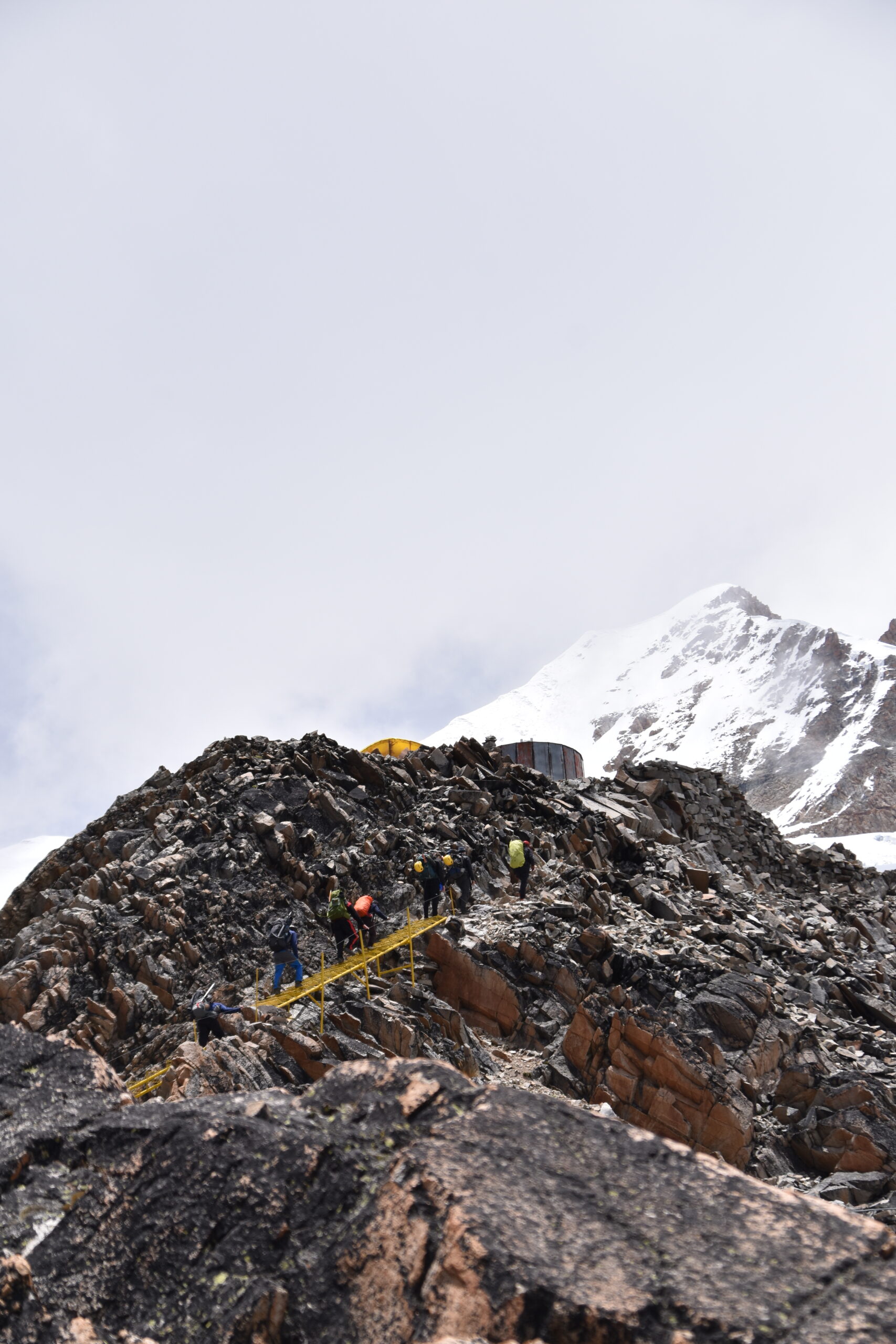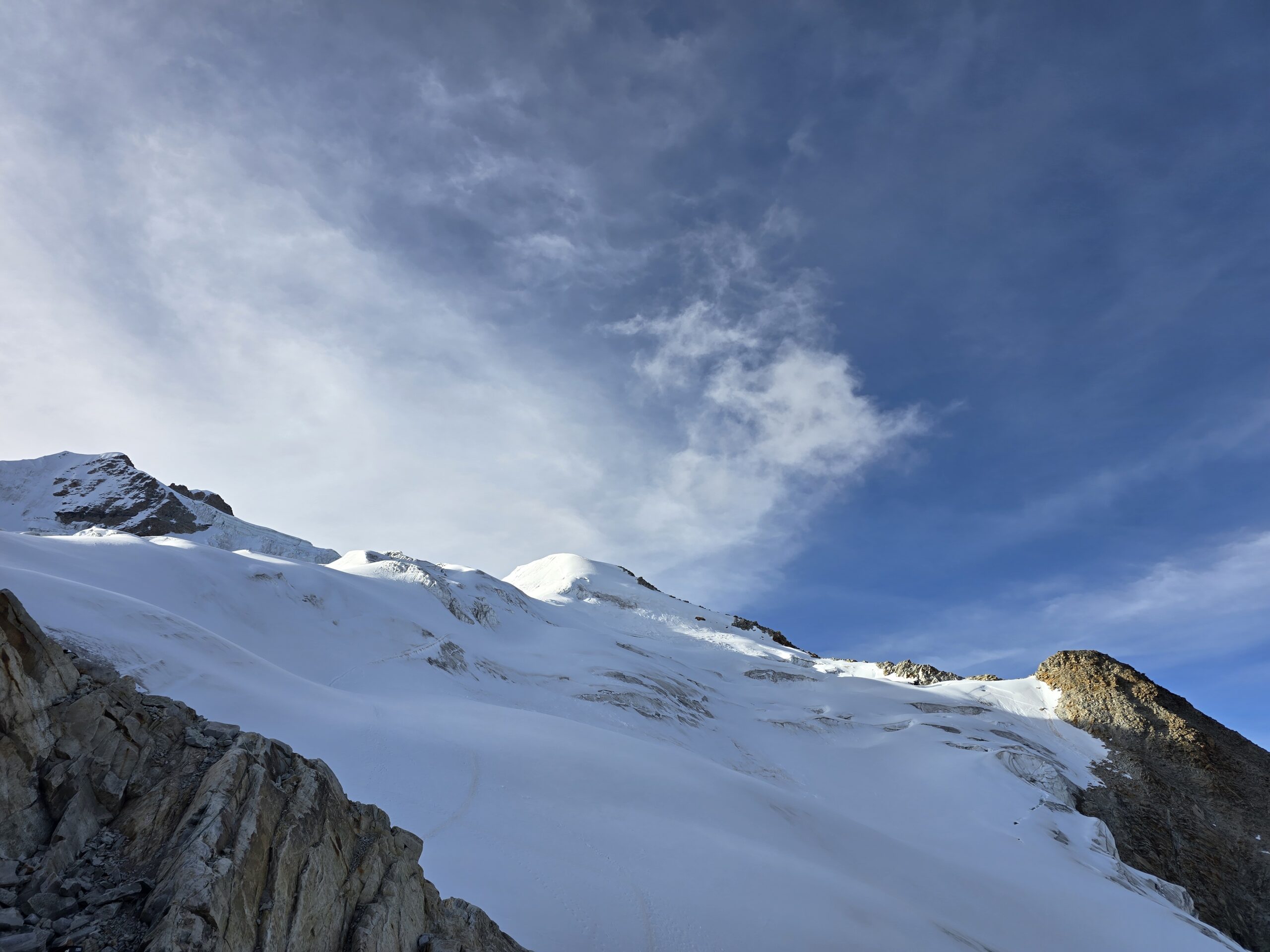 Angekommen wurden als Erstes die Betten bezogen, es gab Mittagessen und danach ging es los zum Gletscher auf eine Trainingsrunde. Denn um diesen Berg besteigen zu können, musste man Steigeisen und Eispickel nutzen und das sollte vorher einmal ausprobiert werden. Also wurden einmal die verschiedenen Schritte ausprobiert, die man an verschieden steilen Stellen nutzt und danach ging es ans Eisklettern. Die Route, die ich geklettert bin, hatte einen kleinen Überhang und man hatte kaum halt mit den Füßen. Die ganze Sache war auch maximal anstrengend, da wir uns ja über 5000m befunden haben.