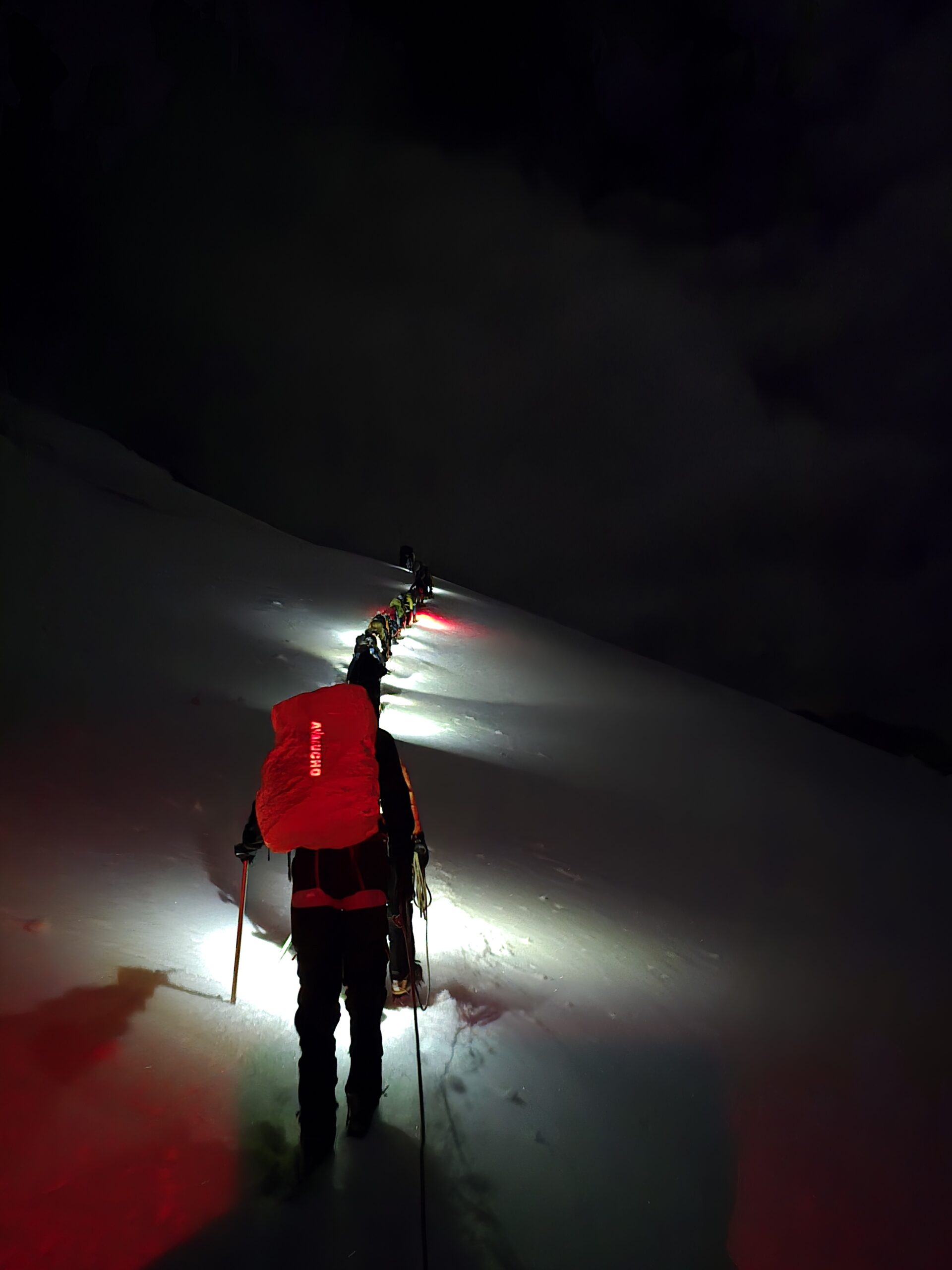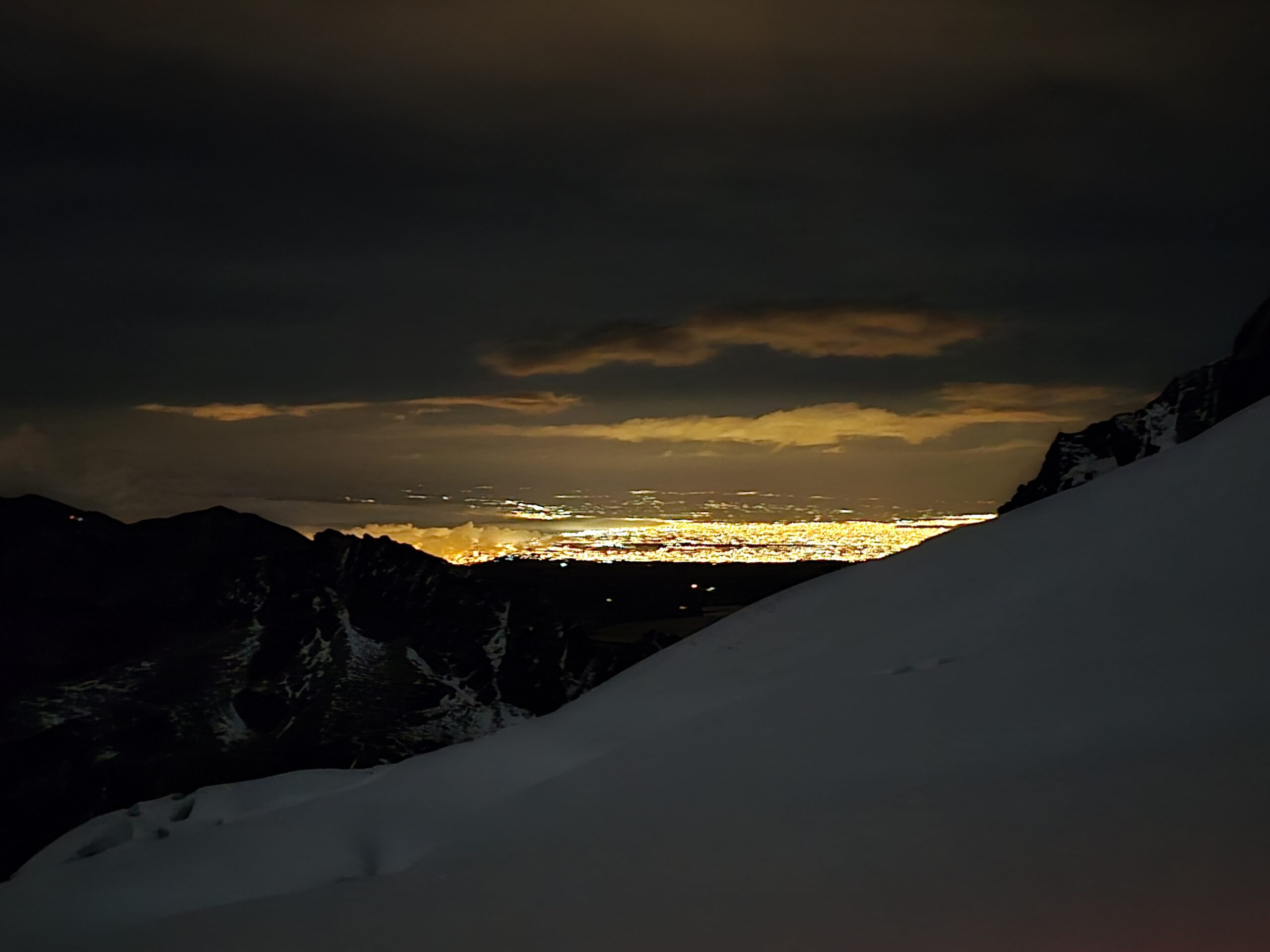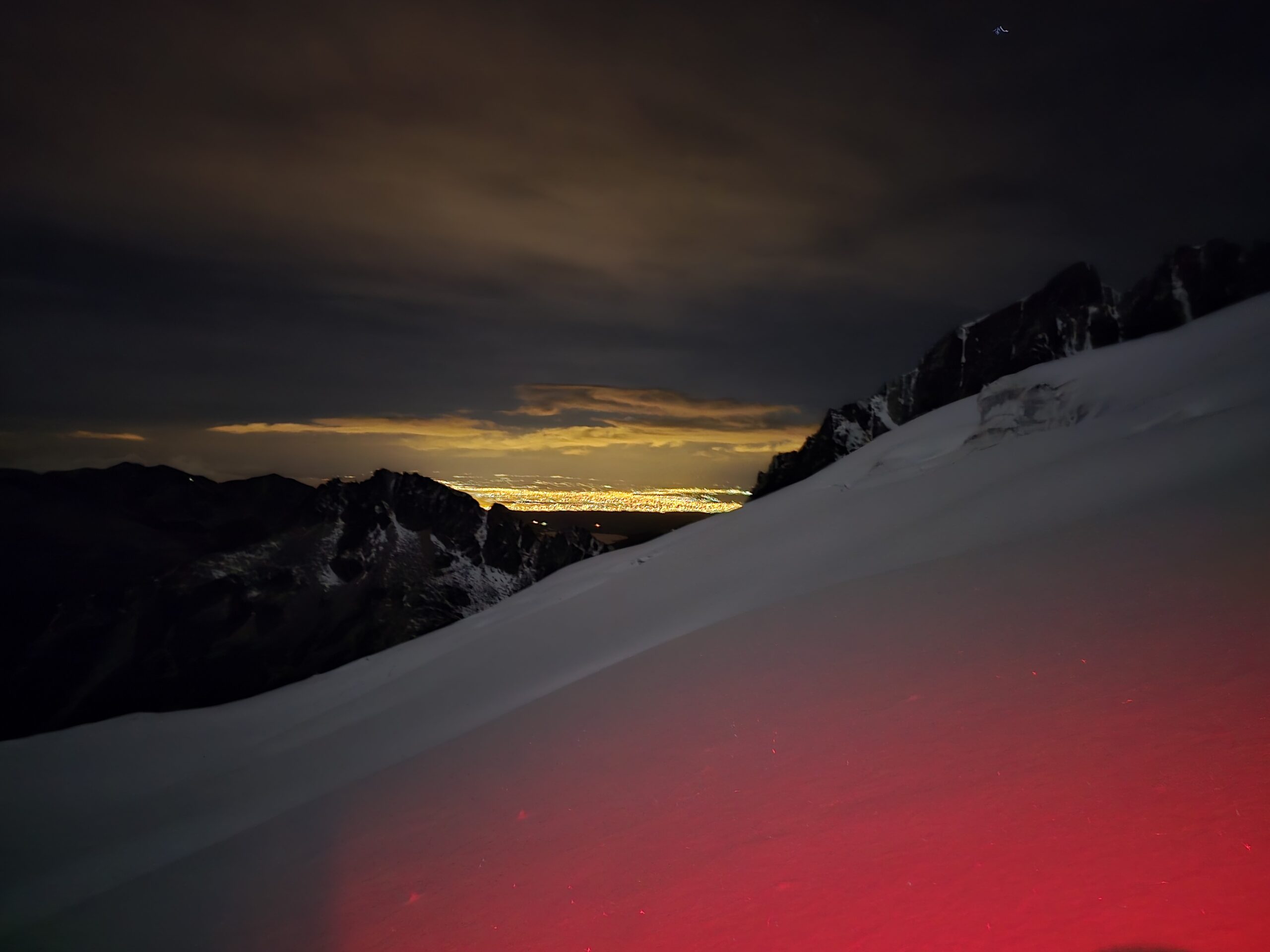 Danach ging es dann direkt los. 800m Aufstieg in etwas unter 3km und das mitten in der Nacht, damit man zum Sonnenaufgang oben ist. Ich hatte mir einen Ohrstöpsel reingemacht und war die ganze Zeit am Hardstyle pumpen. Normalerweise höre ich beim Wandern ja keine Musik, aber hier hatte man nur das Knacken des Schnees unter den Schuhen und ich brauchte etwas Motivation. Bei der ersten Pause kam dann schon die erste Überraschung, eine aus der Gruppe hat es nicht gepackt und musste umdrehen. Aus unserer Zweiergruppe wurde ab hier also eine Dreiergruppe.