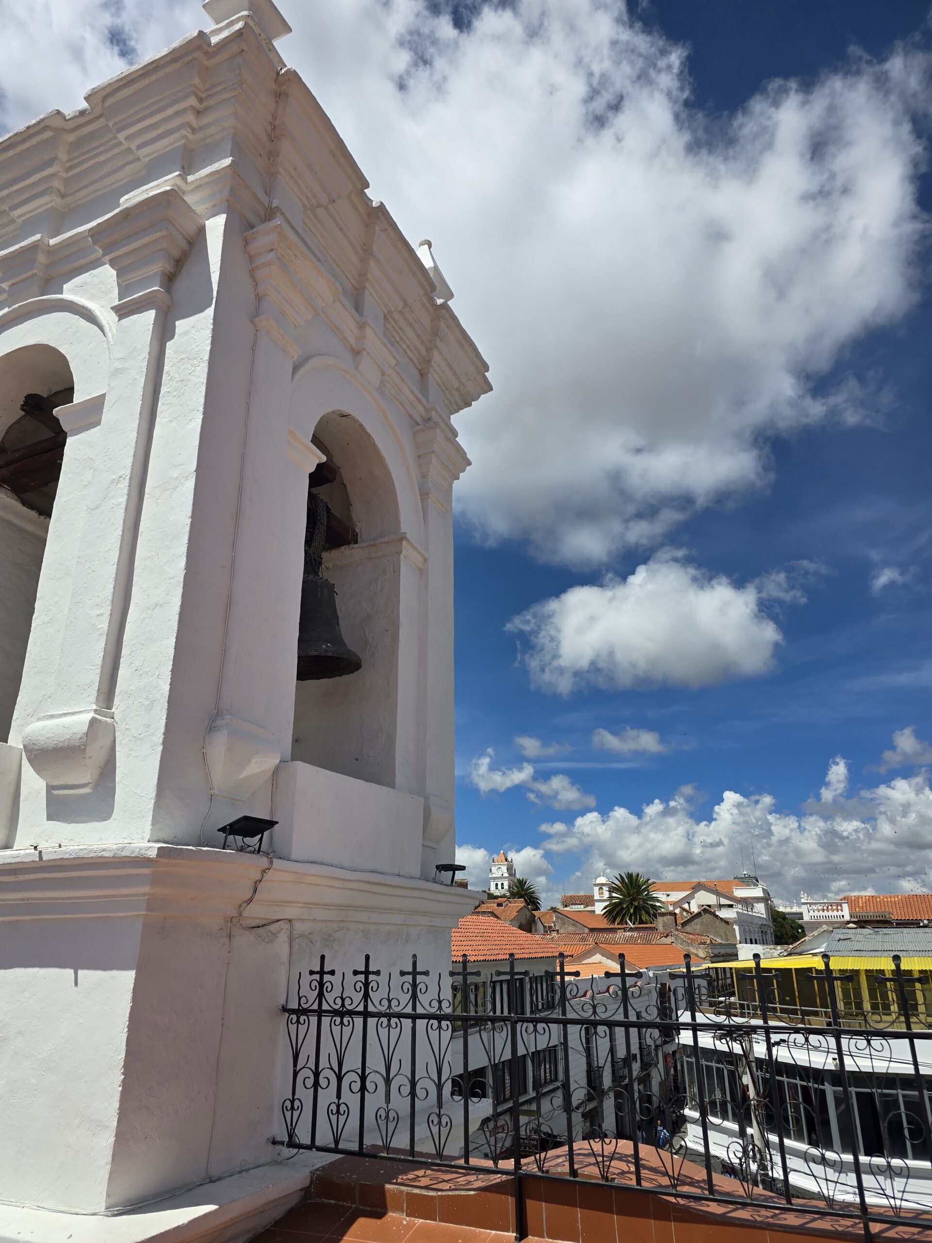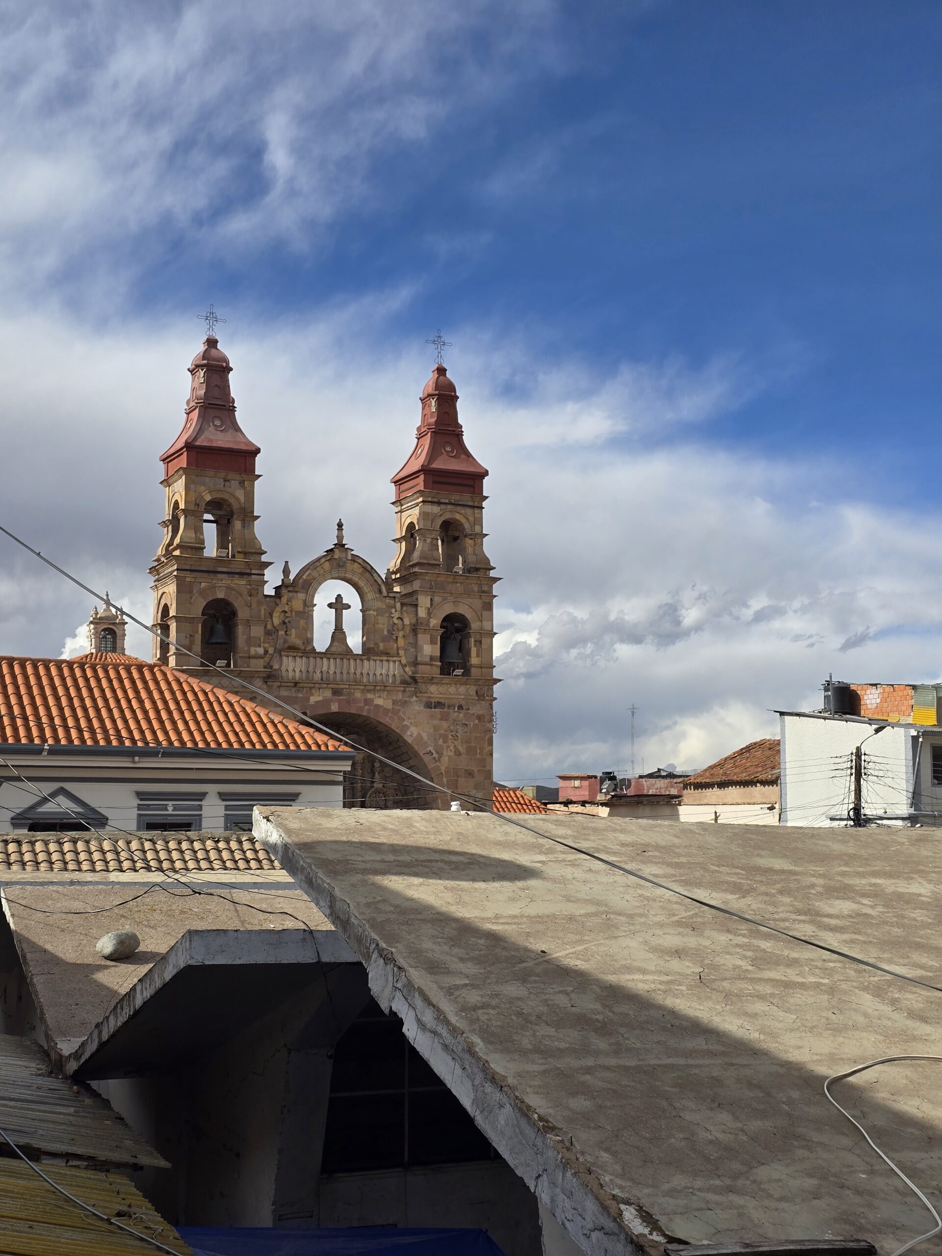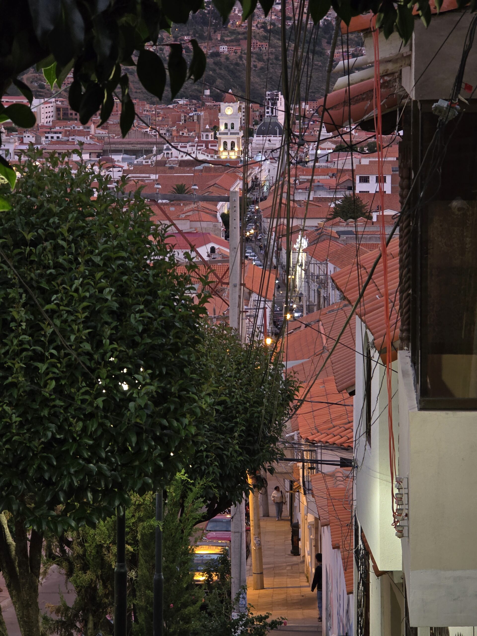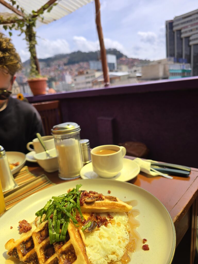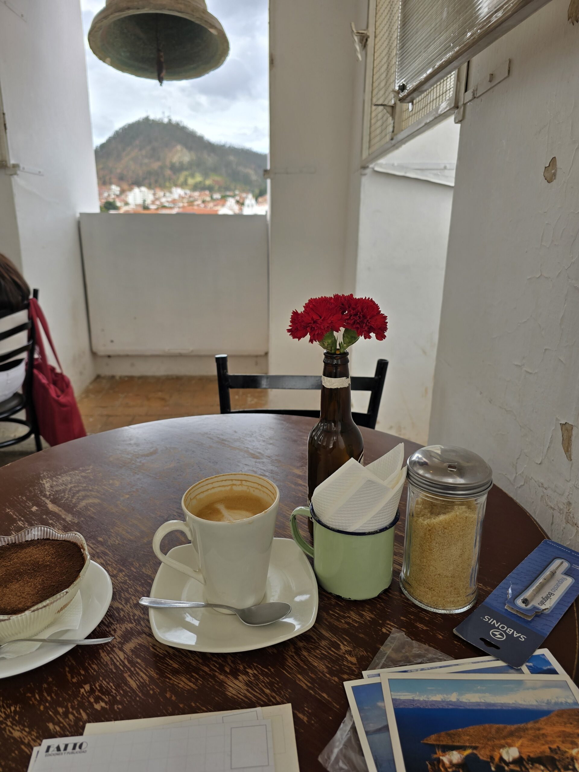 Remy und Jurrän wollten an diesem Tag schon weiter nach Potosí. Ich wäre zwar gerne noch einen Tag geblieben, aber da schließe ich mich denen natürlich an. Nach dem Frühstück musste ich erstmal den Sauhaufen aufräumen, den ich gestern hinterlassen als ich alle meine Sachen einfach so hingeworfen hatte. Danach bin ich in ein Café, in das ich schon vorher wollte. Es ist oben auf einer Terrasse einer Kirche.