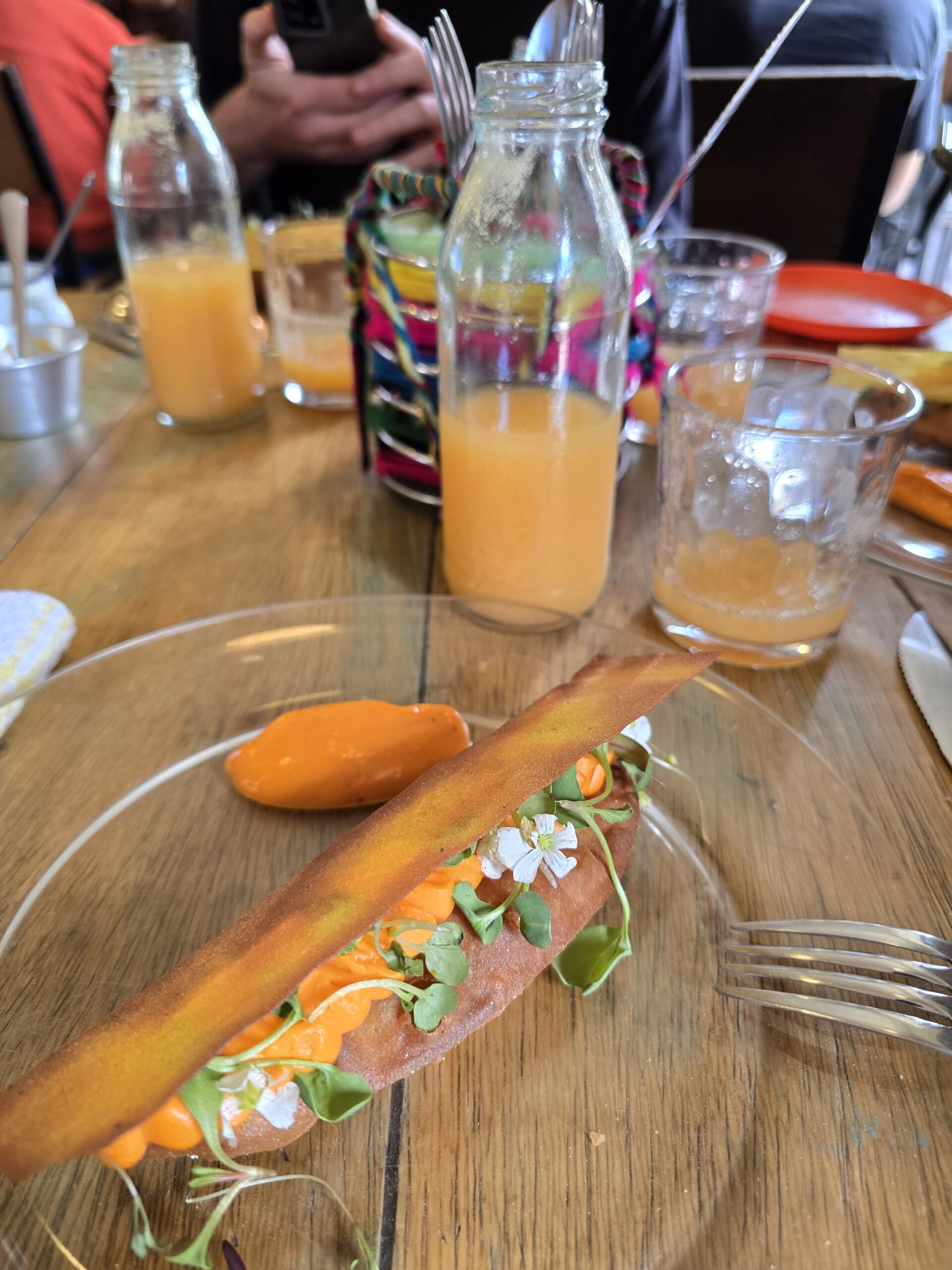 Als wir Sucre näher kamen, hielt der Bus dann alle 500m an, um Leute rauszulassen. Die Zeit war schon etwas knapp, denn wir waren um 18:30 zum Essen verabredet, also bin ich kurzerhand ausgestiegen und habe ein Taxi für den restlichen Weg genommen. Am Ende hat auch alles geklappt und nach der Dusche hatte ich im Hostel sogar noch Zeit gemütlich ein Bierchen zu trinken. Danach traf ich mich dann mit Remy beim Nativa, einem Restaurant das ein 9-Gänge-Menü für absurd günstige 250Bs mit Getränken anbietet. Ich war dann etwas überrascht, als er meinte, die Gruppe umfasst 13 Personen. Viele aus seiner Sprachschule waren auch mit dabei.