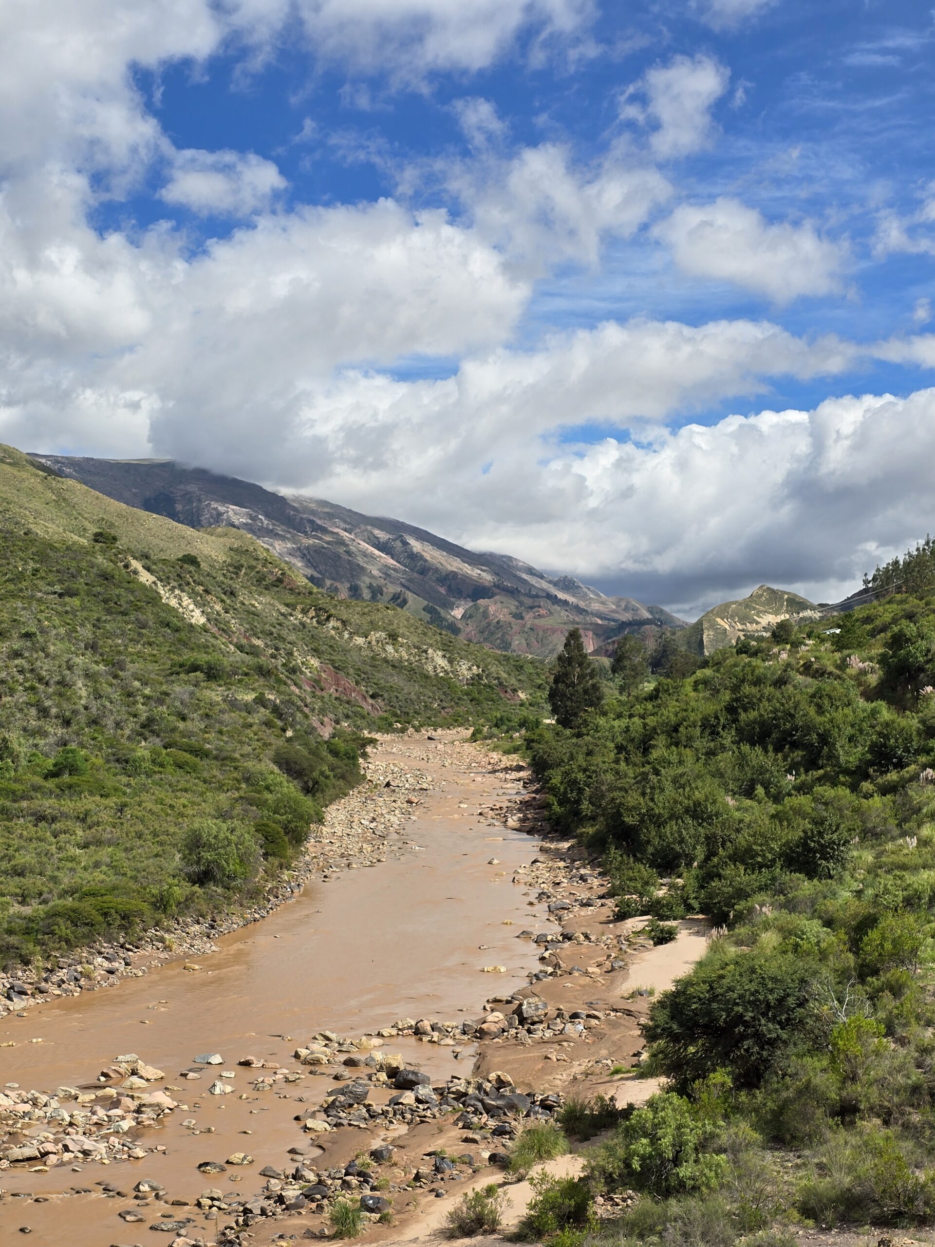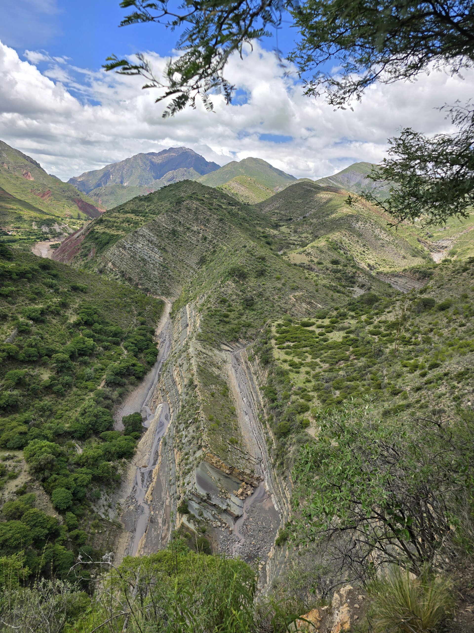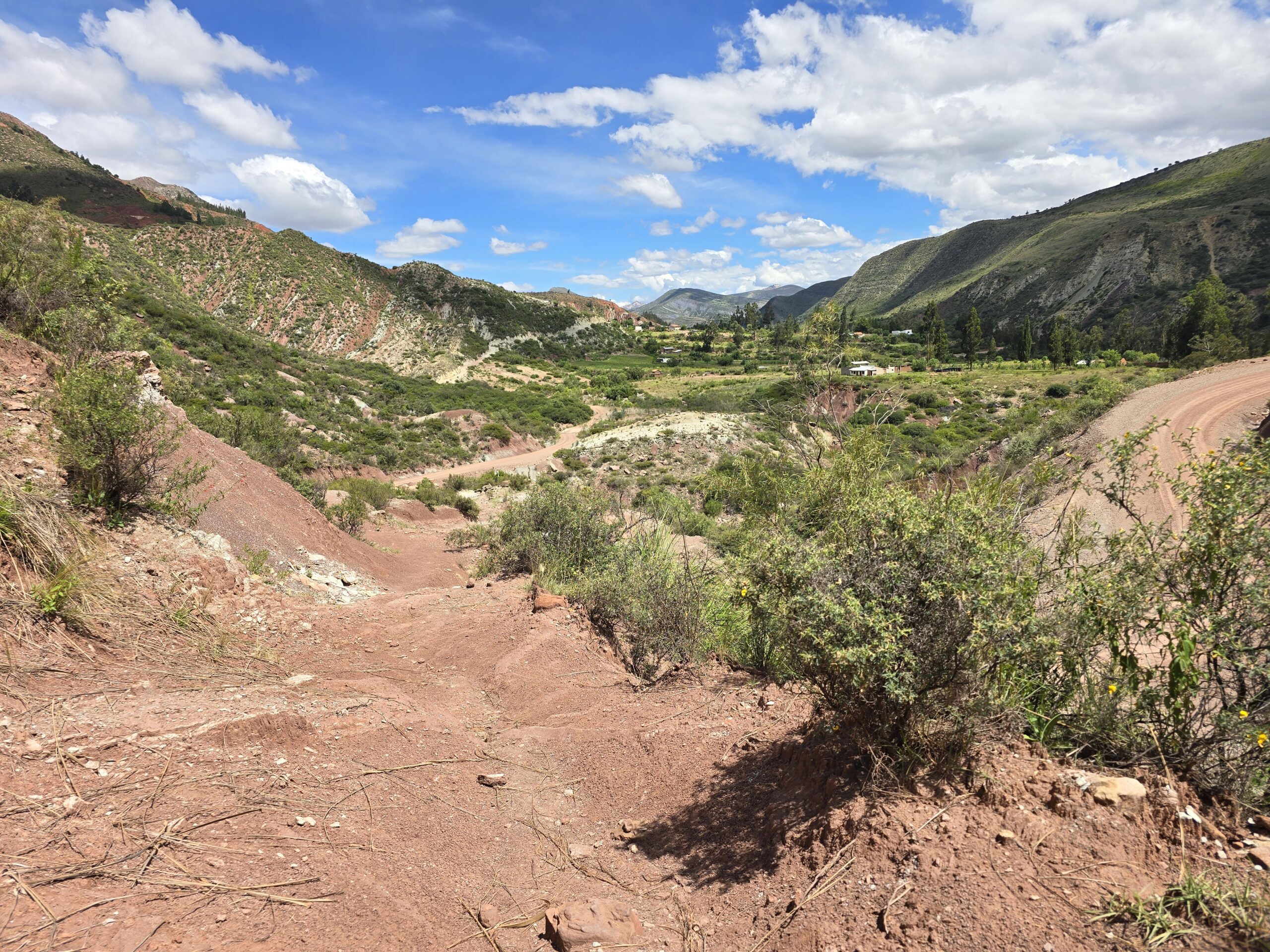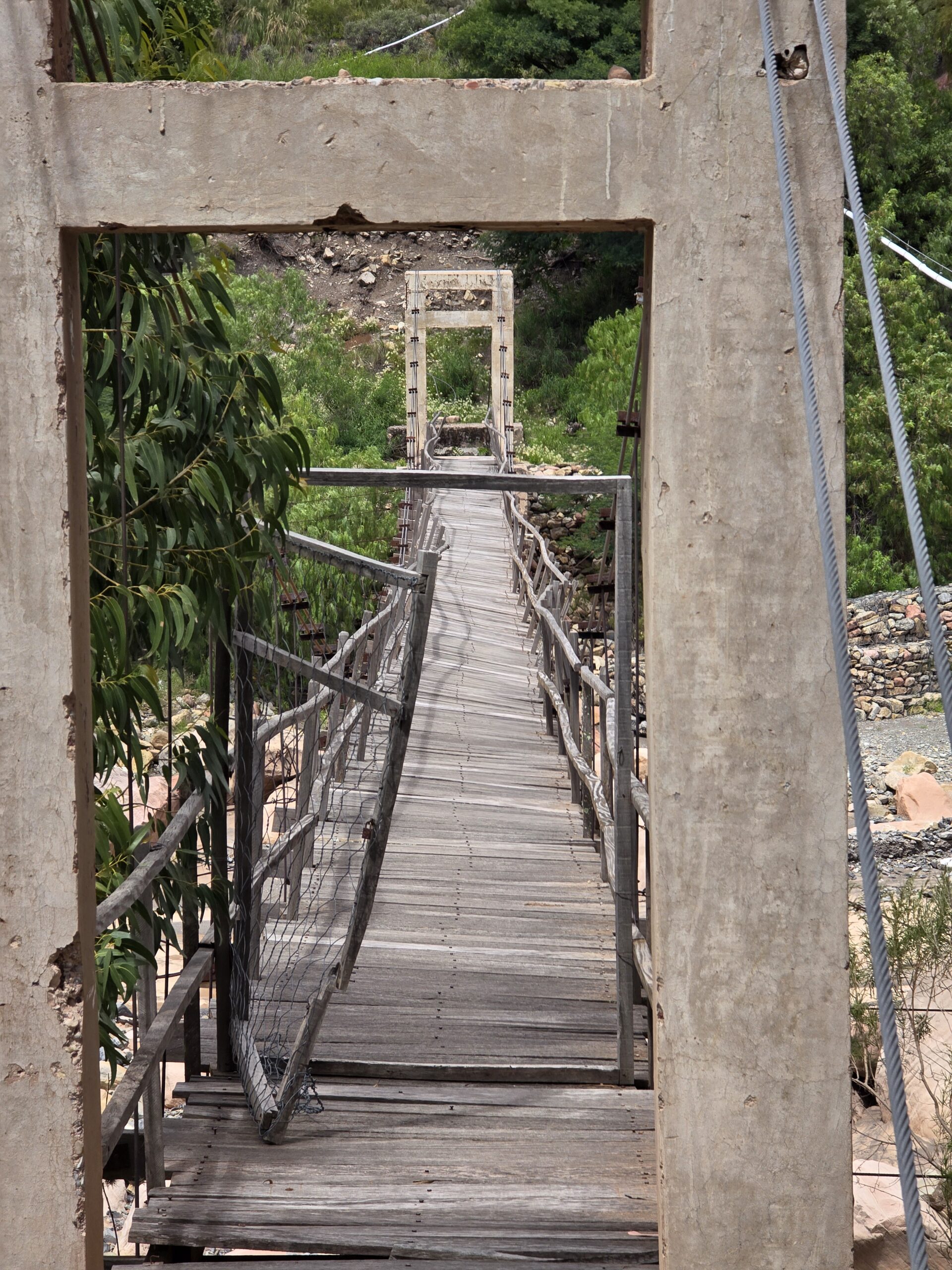 Danach ging es los, die Tour an diesem Tag war etwas länger, aber mit 11 km und etwas über 500 m Anstieg auch nichts Wildes. Erstmal ging es relativ flach am Fluss entlang bis nach Socapampa, dort musste man dann eine doch etwas wenig vertrauenerweckende Brücke überqueren. Danach begann dann der Anstieg. Nach gut 2 km im steilen Stück habe ich dann Pause gemacht und mein Mittagessen verzehrt, das mir das Hostel mitgegeben hatte und das natürlich mit einem tollen Ausblick!