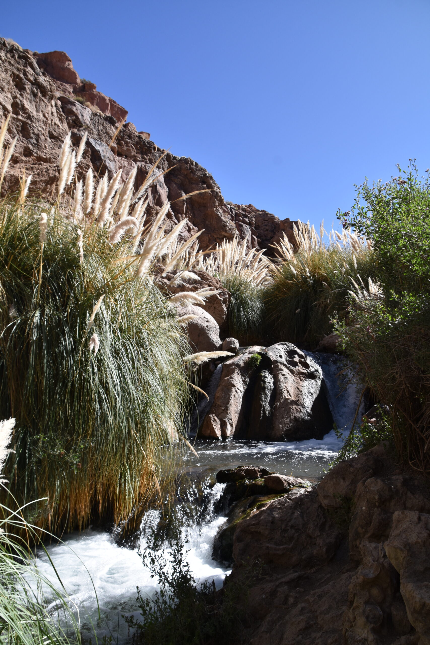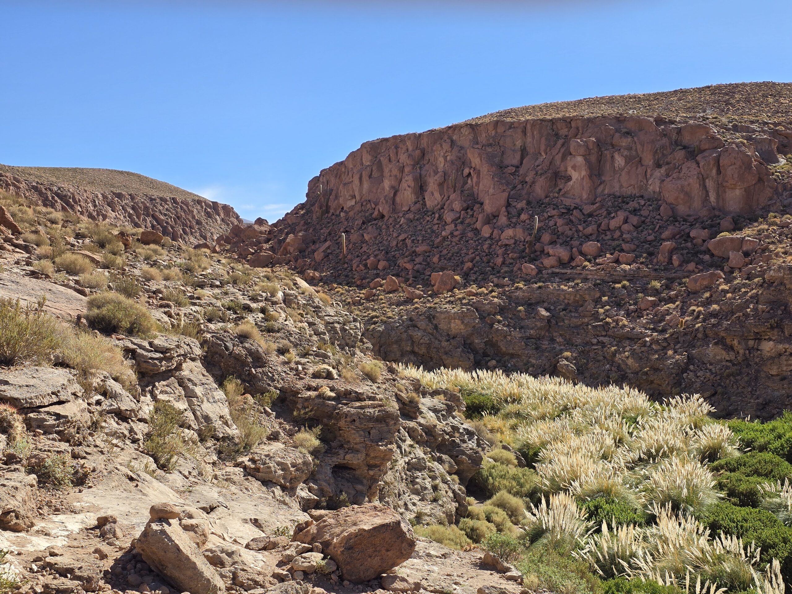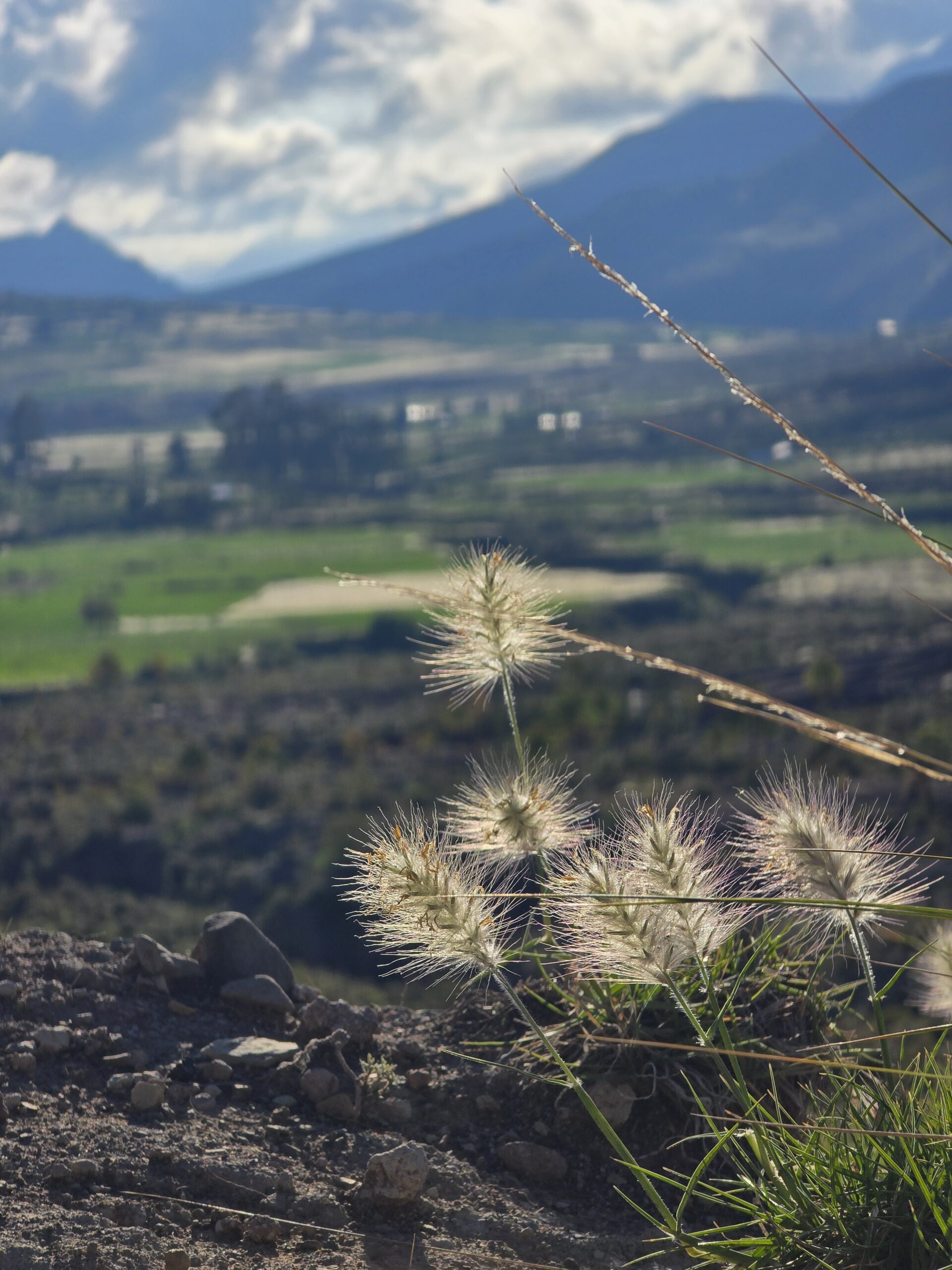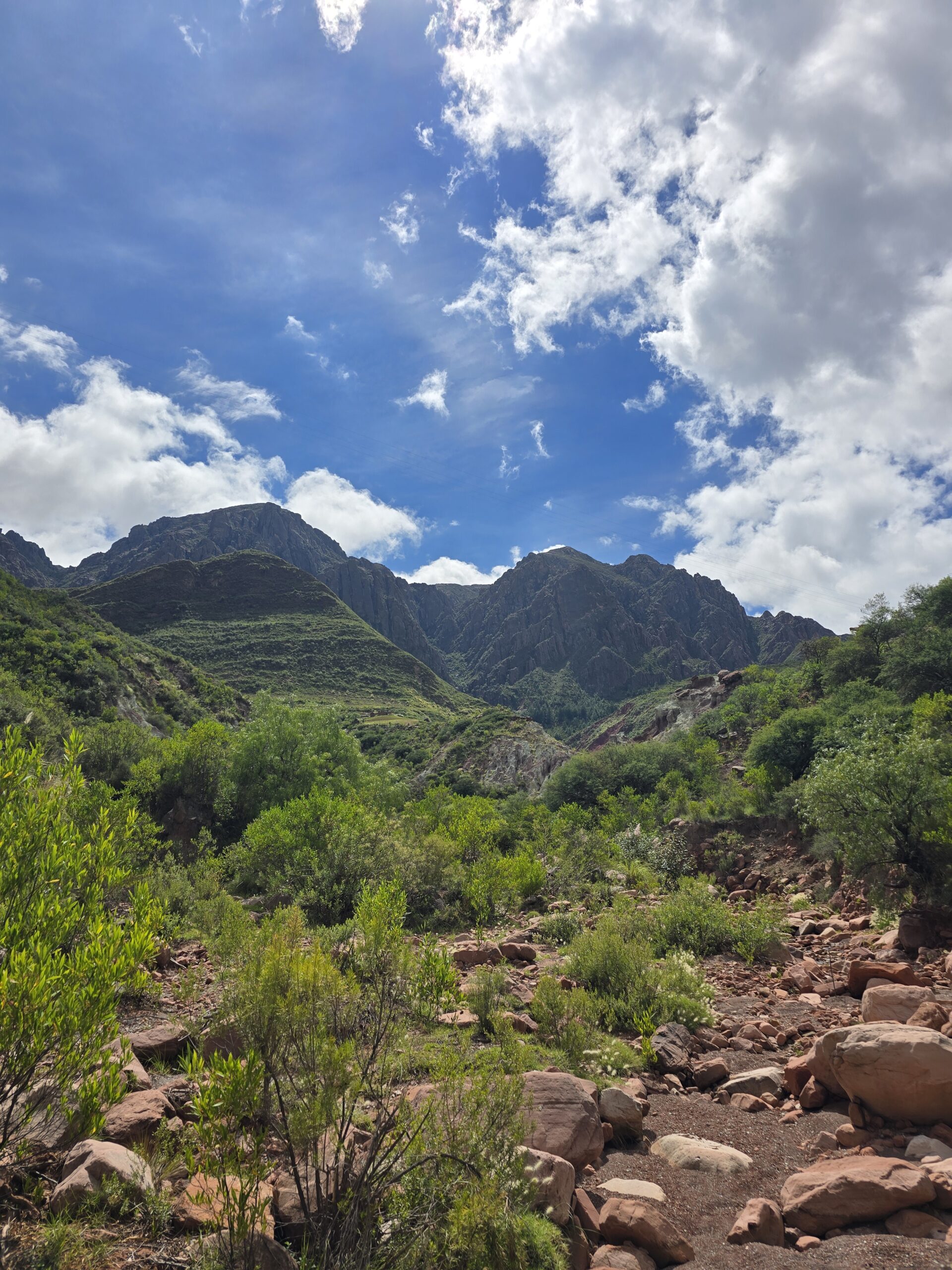 Danach ging es los, die Tour an diesem Tag war etwas länger, aber mit 11 km und etwas über 500 m Anstieg auch nichts Wildes. Erstmal ging es relativ flach am Fluss entlang bis nach Socapampa, dort musste man dann eine doch etwas wenig vertrauenerweckende Brücke überqueren. Danach begann dann der Anstieg. Nach gut 2 km im steilen Stück habe ich dann Pause gemacht und mein Mittagessen verzehrt, das mir das Hostel mitgegeben hatte und das natürlich mit einem tollen Ausblick!