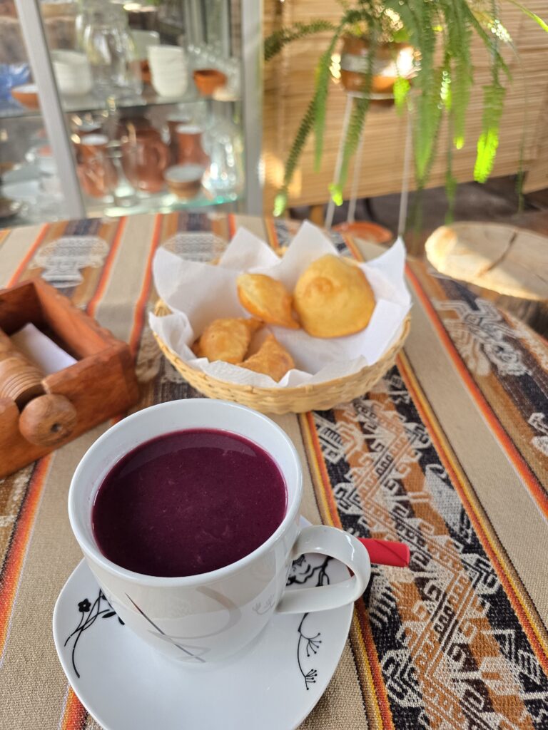 Zum Frühstück gab es dieses Api-Getränk, das ich letztens schon in Cochabamba hatte. Daraufhin habe ich das mal gegoogelt. Es ist ein traditionelles Getränk aus dunklem Maismehl, Zimt, Nelken, Zucker und Zitronenschalen. Wirklich sehr lecker und hat, wie gesagt, etwas von dickflüssigem Glühwein. Dazu gab es traditionelle Teigtaschen mit Käse gefüllt und Obst. Bei dem guten Schlaf, den ich diese Nacht hatte, kann man auch mal auf den Kaffee verzichten. ;D