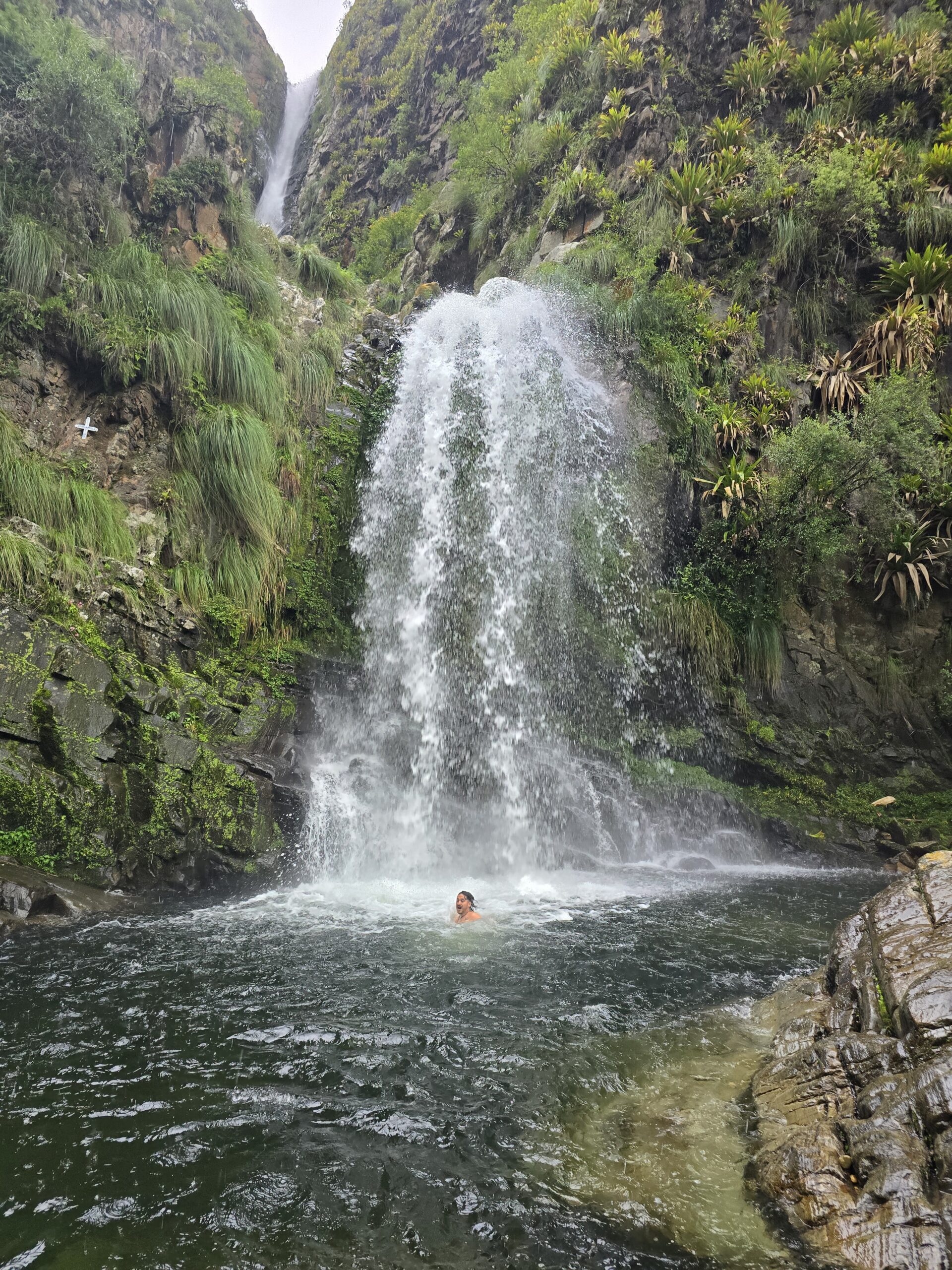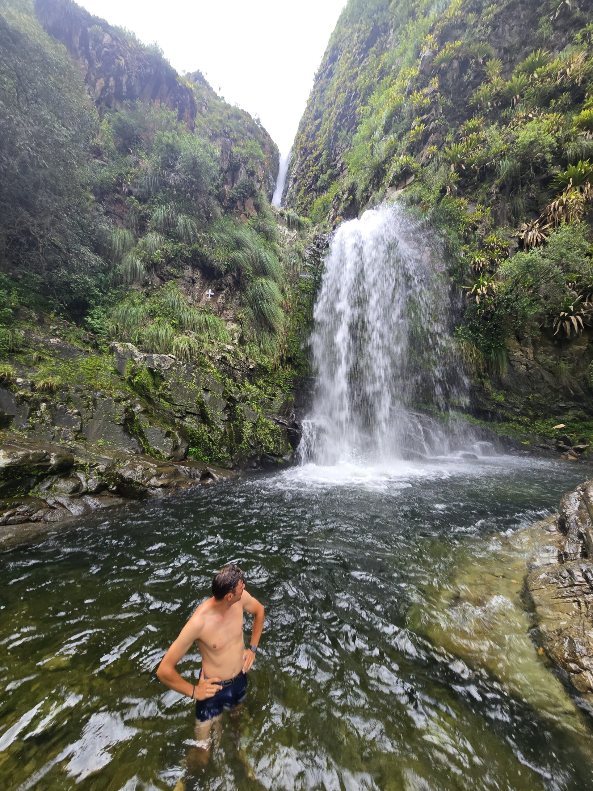 Dort angekommen sind wir erstmal schwimmen gegangen und dabei hat es dann angefangen zu regnen. Zum Glück war dort ein großer Felsen, unter dem wir uns unterstellen konnten und so konnten wir das Ganze im Trockenen abwarten. Der Wasserfall war wirklich unglaublich schön und das Wasser hatte die perfekte Temperatur. Hätte die Sonne geschienen wäre es Perfekt gewesen.