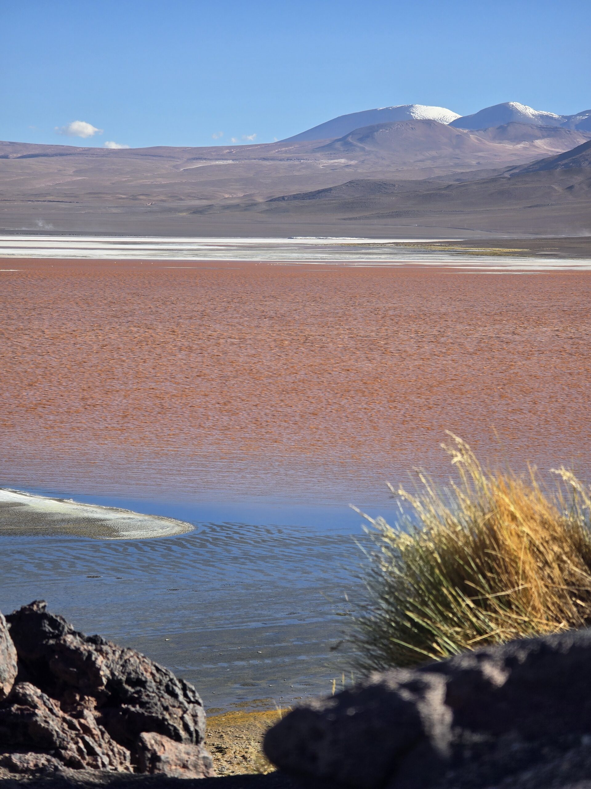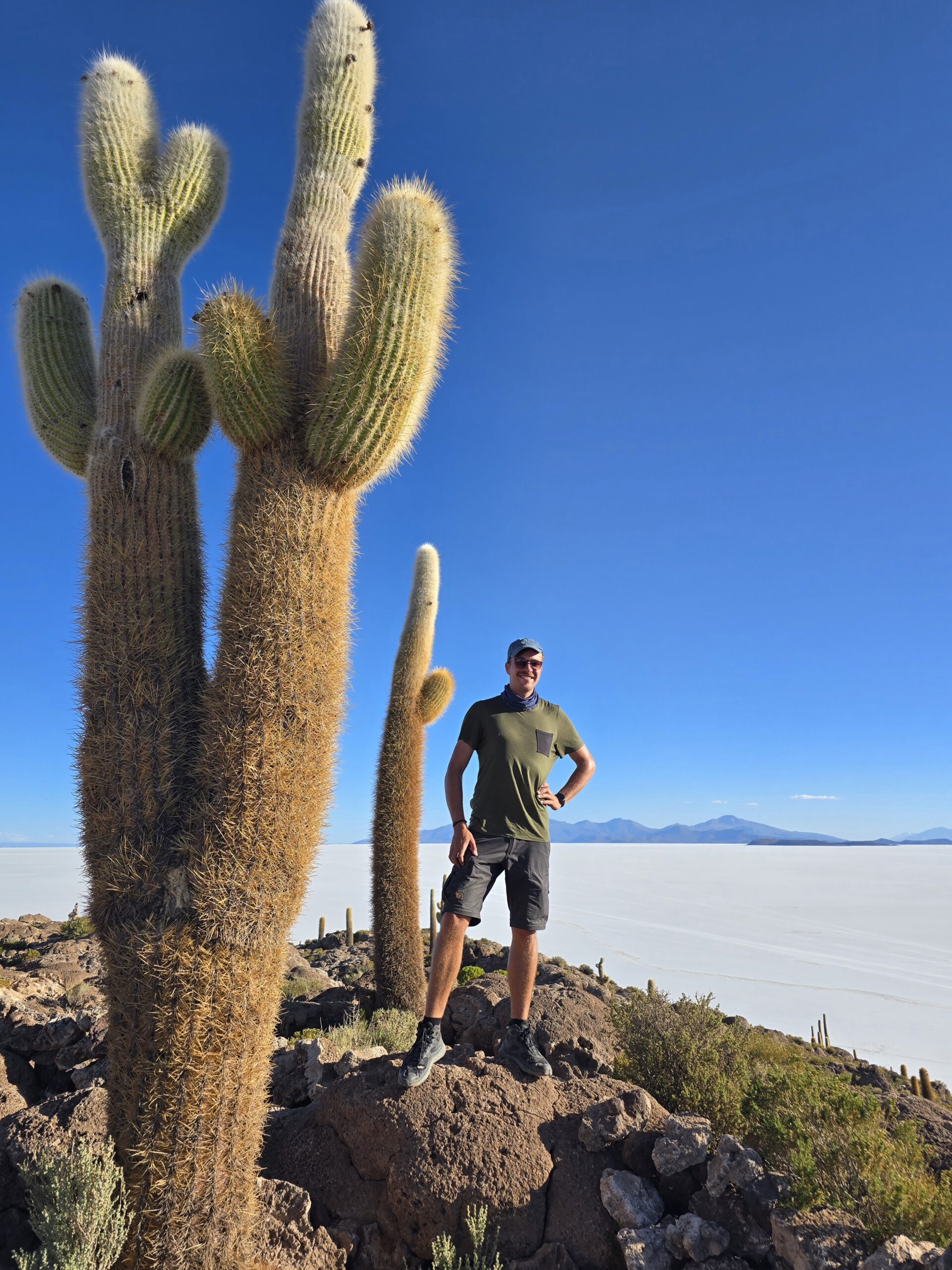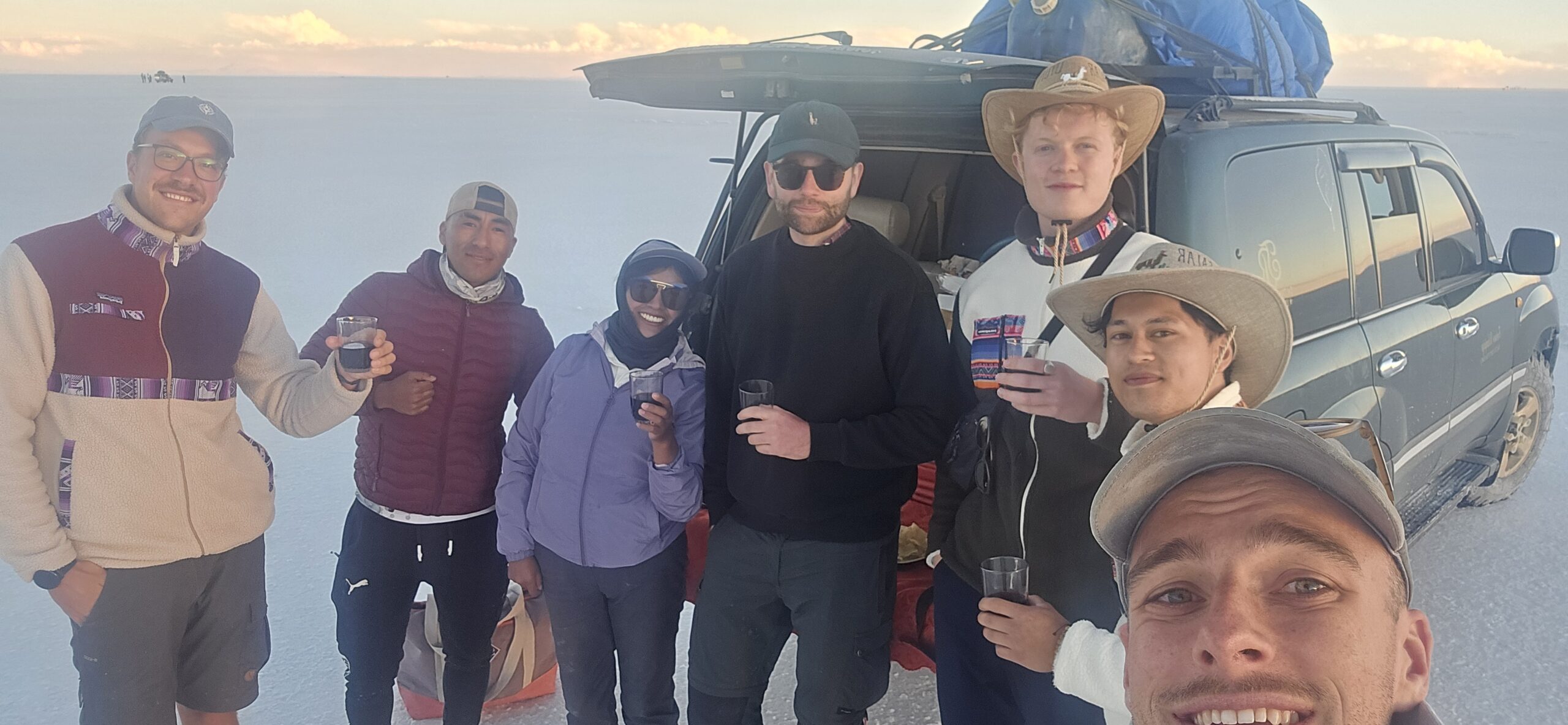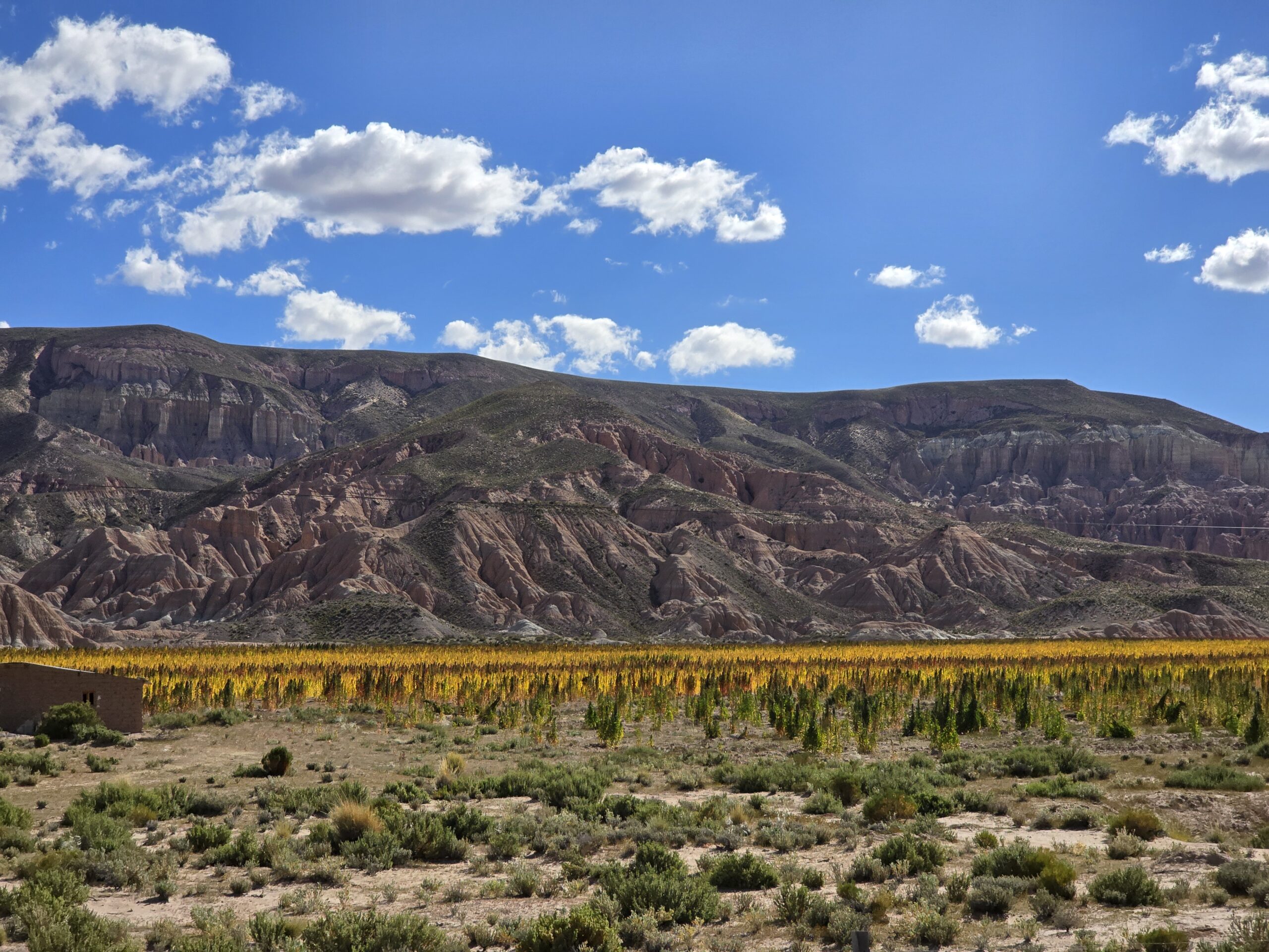 Vor dem Frühstück habe ich mir mit Jurrien den Sonnenaufgang angeschaut. Etwas kalt aber auch sehr schön! Nach dem Frühstück ging es dann los. Ich dachte, man ist wirklich tagelang in der Salzwüste unterwegs, aber es ist nur der erste Tag. Es ging also rauf in die Berge und der erste Stop war ein Ort in dem Quinoa angebaut wird. Erstaunlich wie viele verschiedene Sorten es gibt! Danach ging es relativ schnell weiter zu einem Aussichtspunkt auf einen Aktiven Vulkan. Dort gabs dann lecker LLama Wurst im Brötchen, die beste die ich bislang in Bolivien hatte!