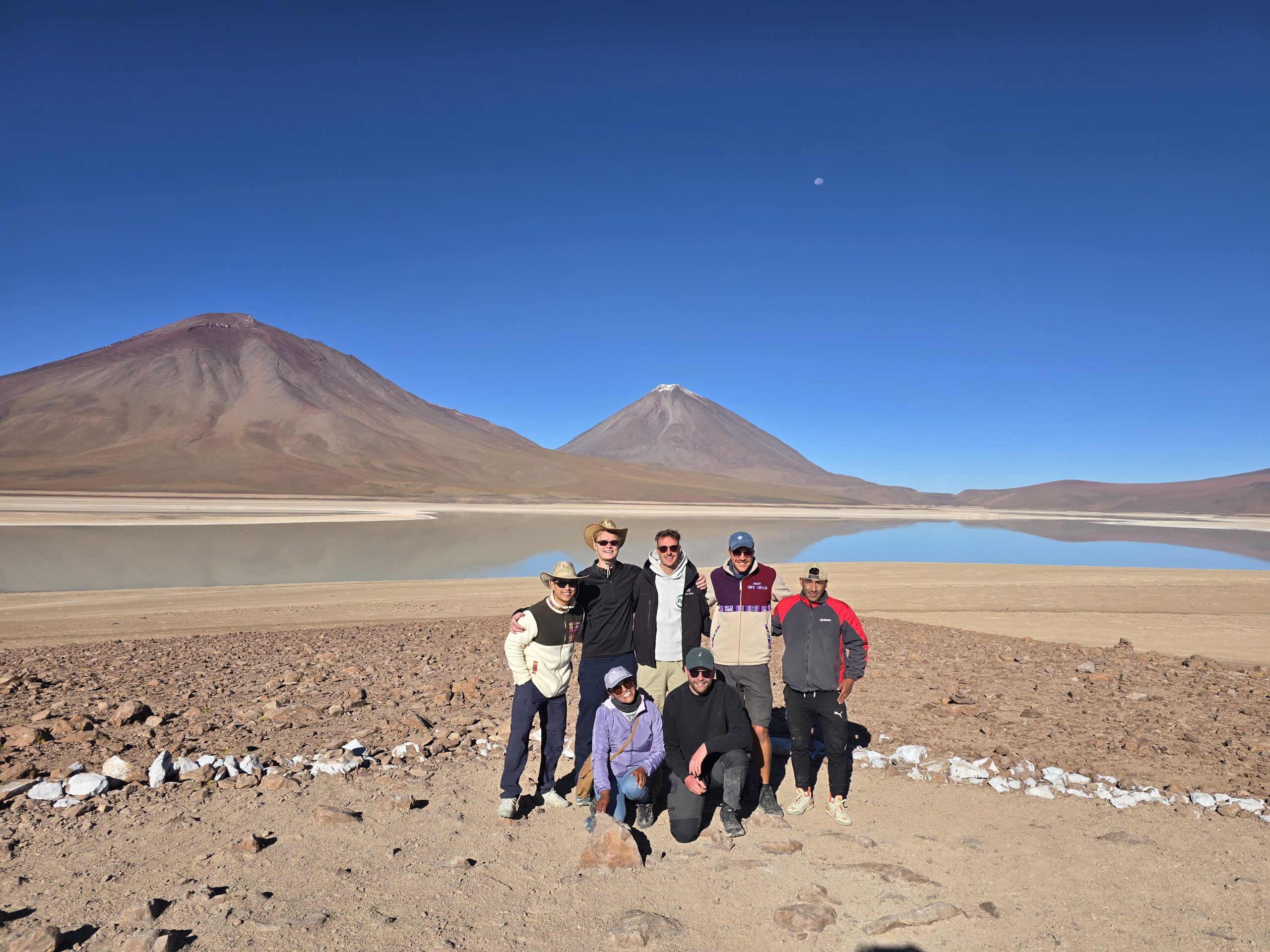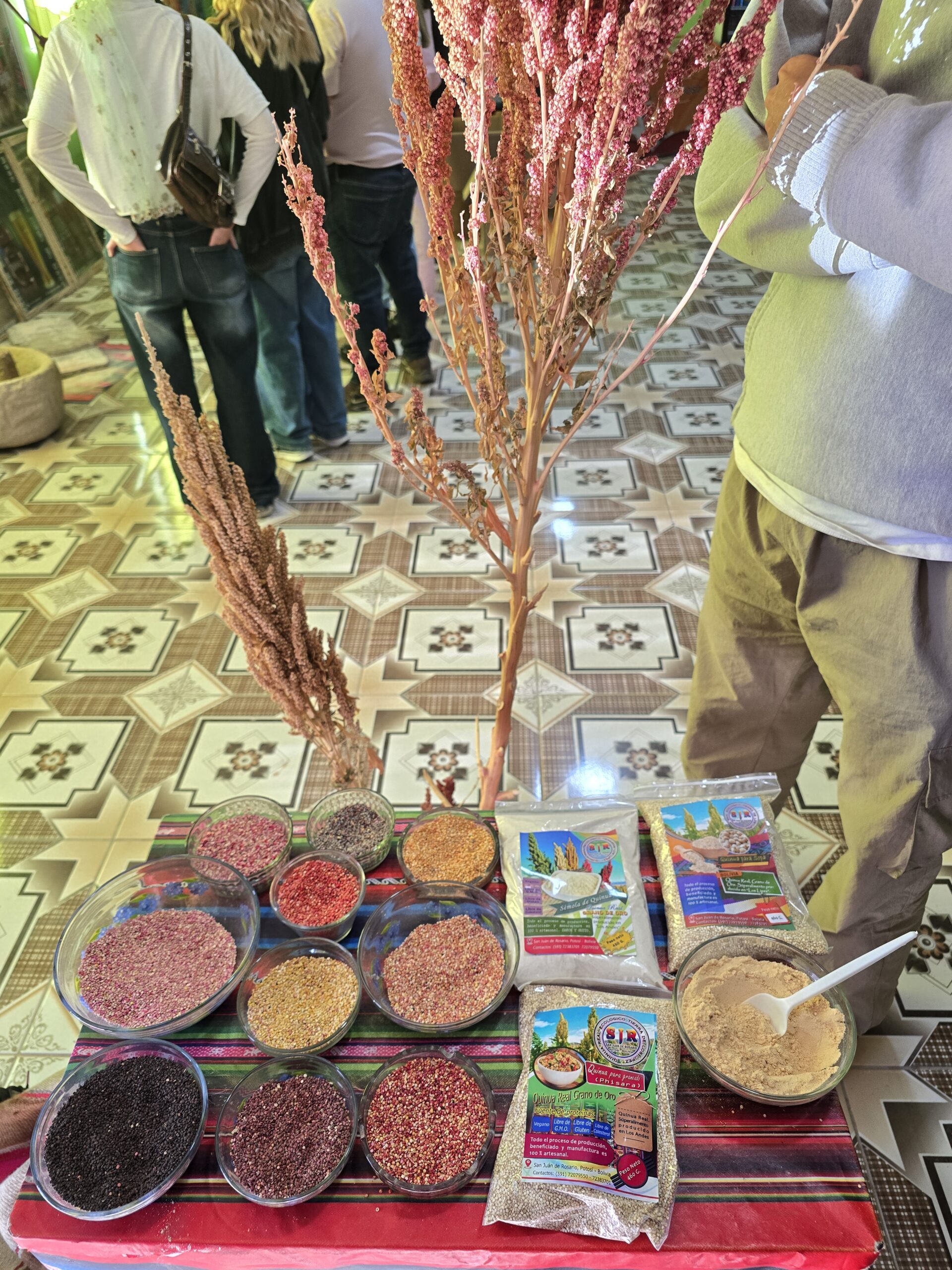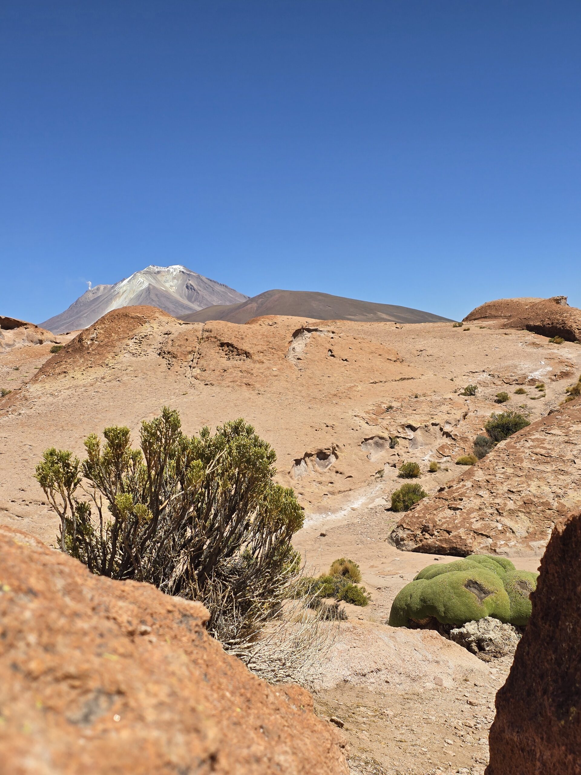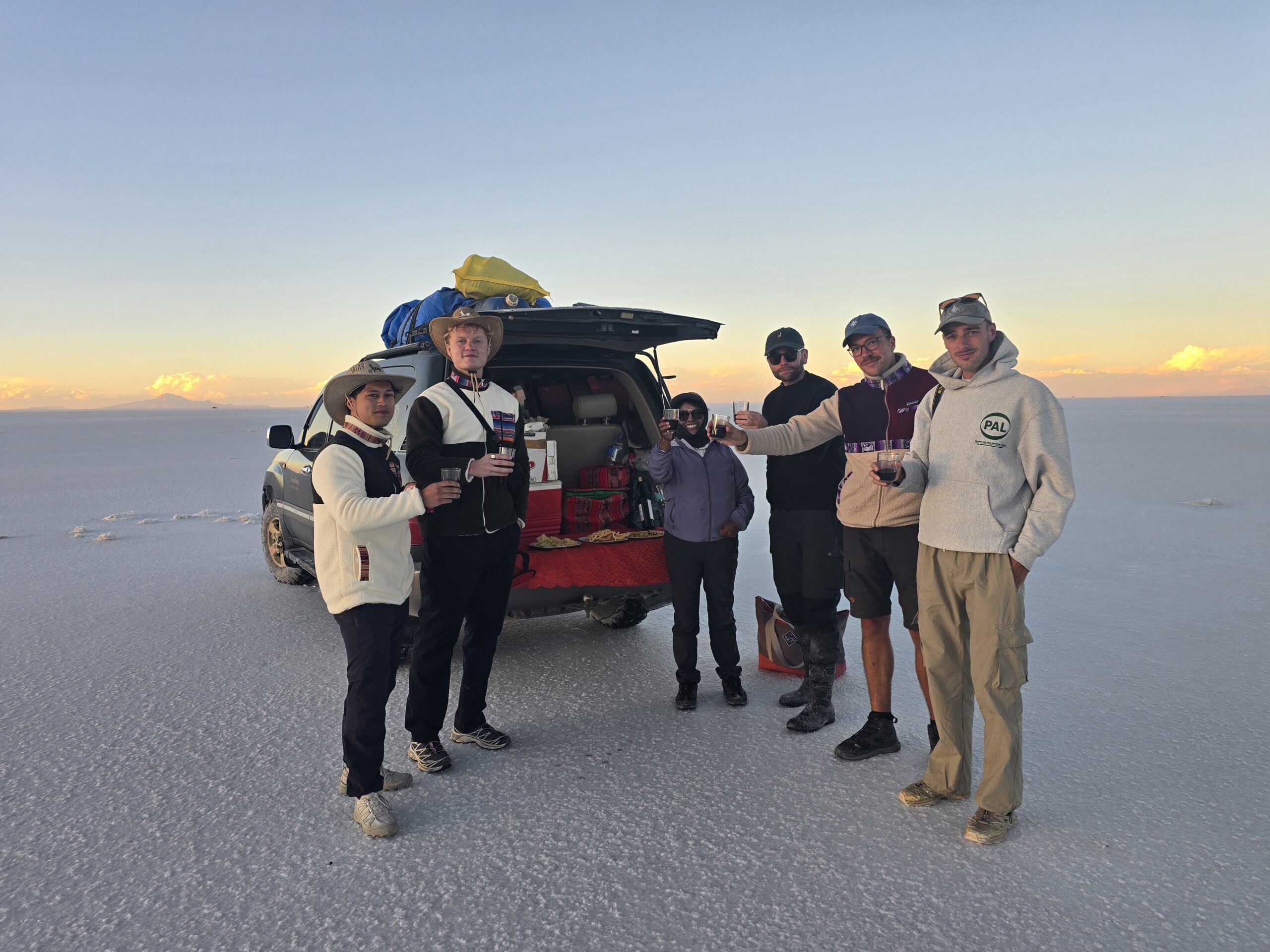 Vor dem Frühstück habe ich mir mit Jurrien den Sonnenaufgang angeschaut. Etwas kalt aber auch sehr schön! Nach dem Frühstück ging es dann los. Ich dachte, man ist wirklich tagelang in der Salzwüste unterwegs, aber es ist nur der erste Tag. Es ging also rauf in die Berge und der erste Stop war ein Ort in dem Quinoa angebaut wird. Erstaunlich wie viele verschiedene Sorten es gibt! Danach ging es relativ schnell weiter zu einem Aussichtspunkt auf einen Aktiven Vulkan. Dort gabs dann lecker LLama Wurst im Brötchen, die beste die ich bislang in Bolivien hatte!