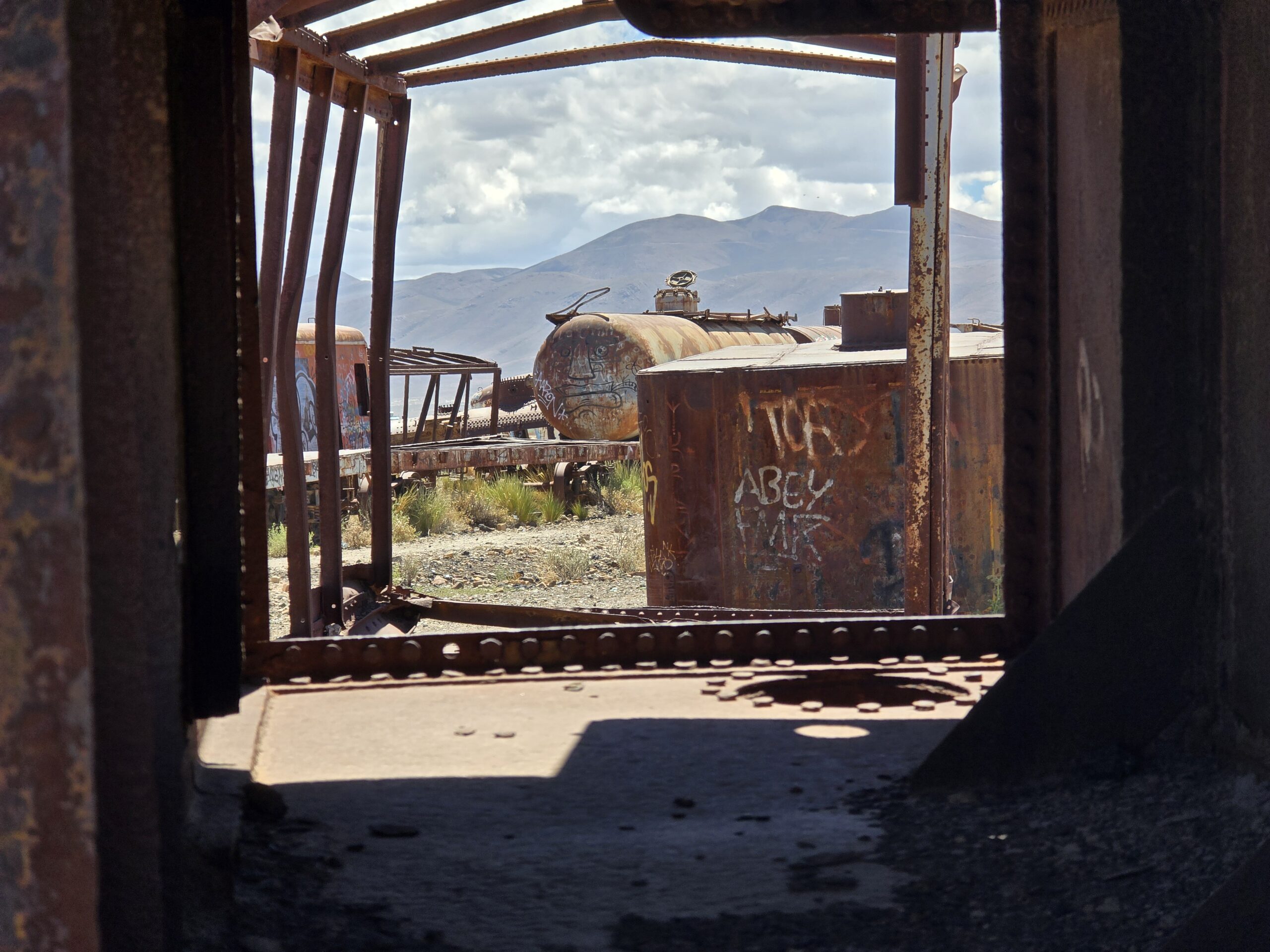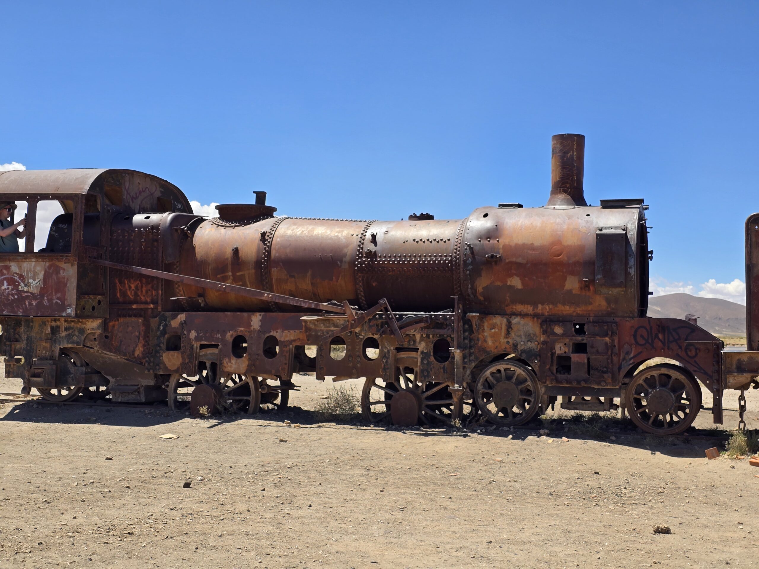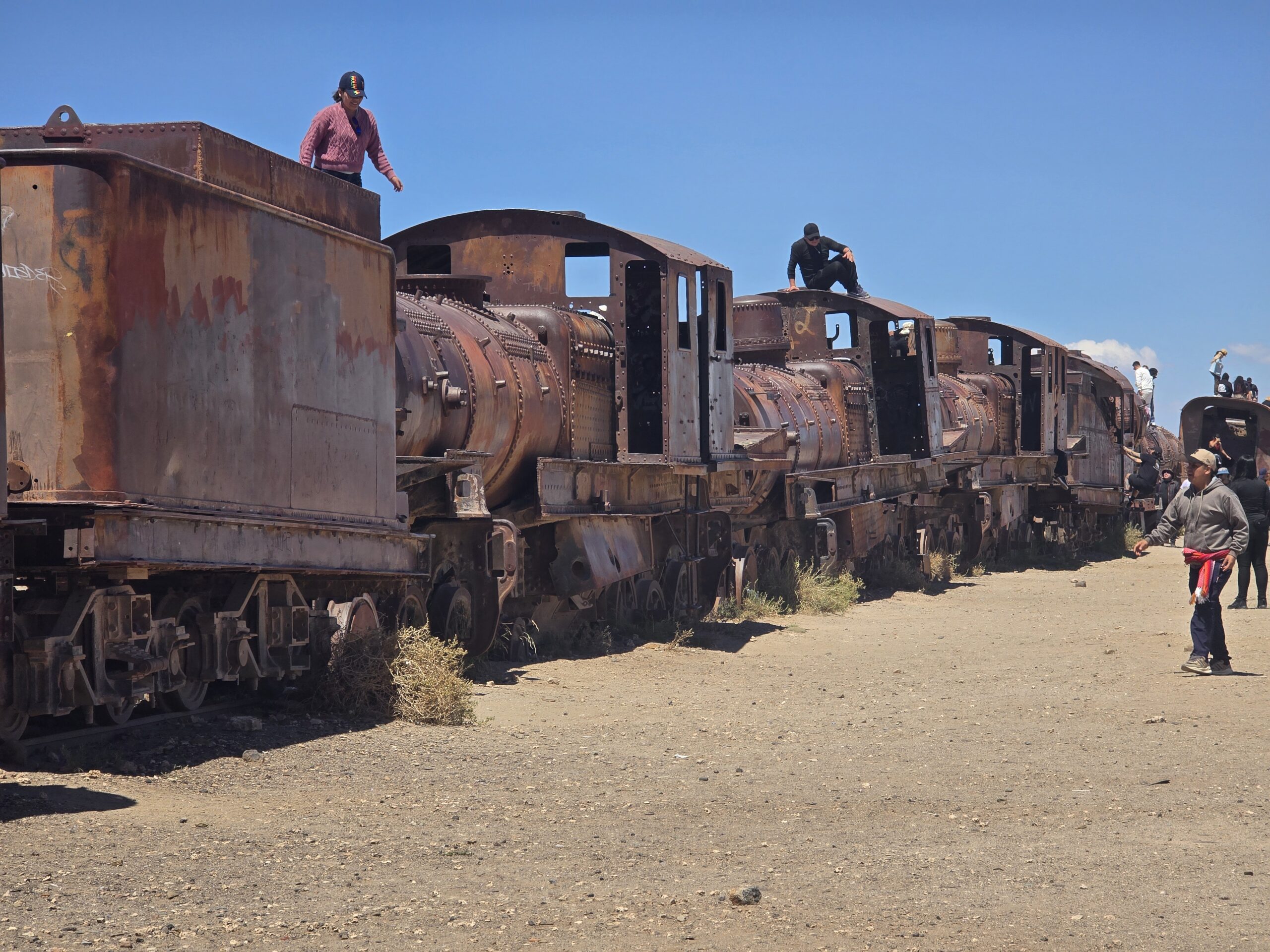 Hier war es leider sehr voll, das versaut mir immer ein bisschen die Erfahrung, wie z. B. auch in Machu Picchu. Wir sind dann ein bisschen weiter in das Gebiet hineingelaufen, um etwas mehr für uns zu sein. Die Eisenbahnlinien führen nach Chile an die Küste. Diese wurden nach dem Krieg zwischen Chile und Bolivien gebaut, als Bolivien seine Küste verloren hat. Früher wurde hier alles Transportiert, auch Menschen. Heute wird aber nur noch Fracht transportiert, da neue Straßen gebaut wurden auf denen die Menschen transportiert werden.