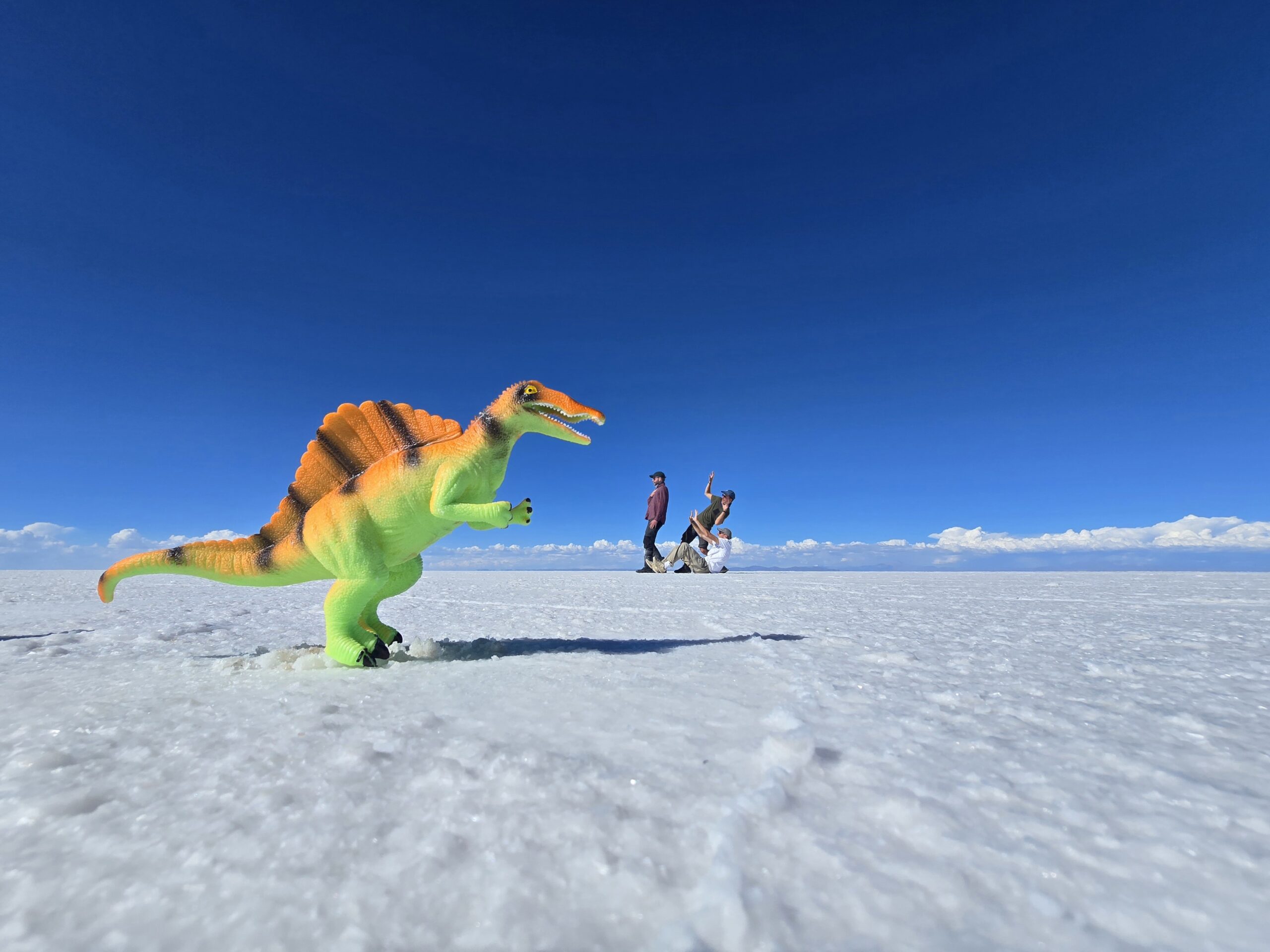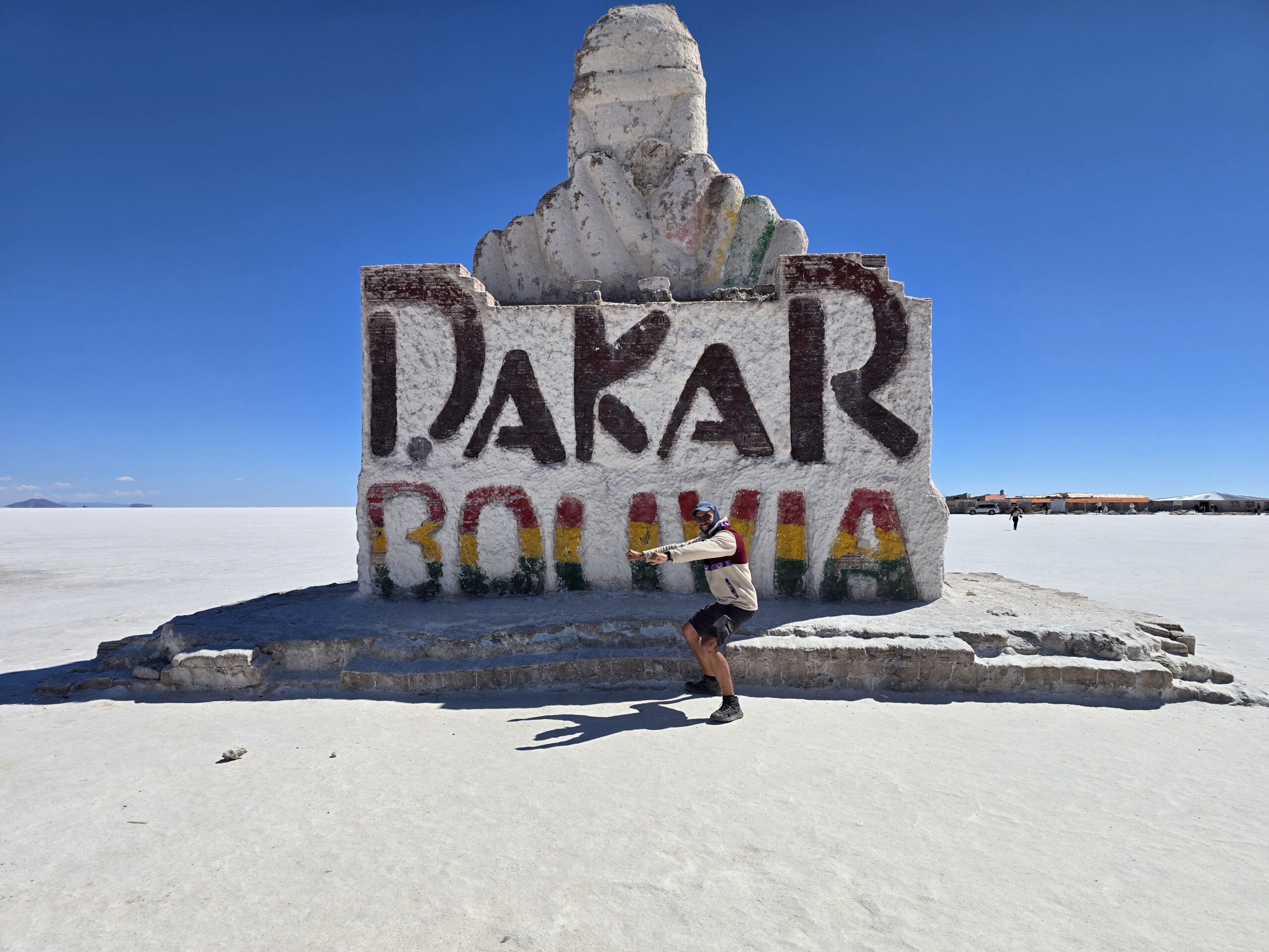 Zwischendurch haben wir uns noch das Dakar Monument angeschaut und den Flaggenplatz, nicht zu spannend. Danach ging es immer und immer weiter hinein ist die Salzwüste. Mit gut 100km/h flogen wir darüber hinweg, bis zu einem Ort an dem wir ein paar lustige Bilder mit verzehrten Perspektiven gemacht haben. Die kennt man sicherlich von jedem Touri Bericht, den man so darüber liest, aber wenn man schon mal hier ist lässt man sich das natürlich nicht entgehen.