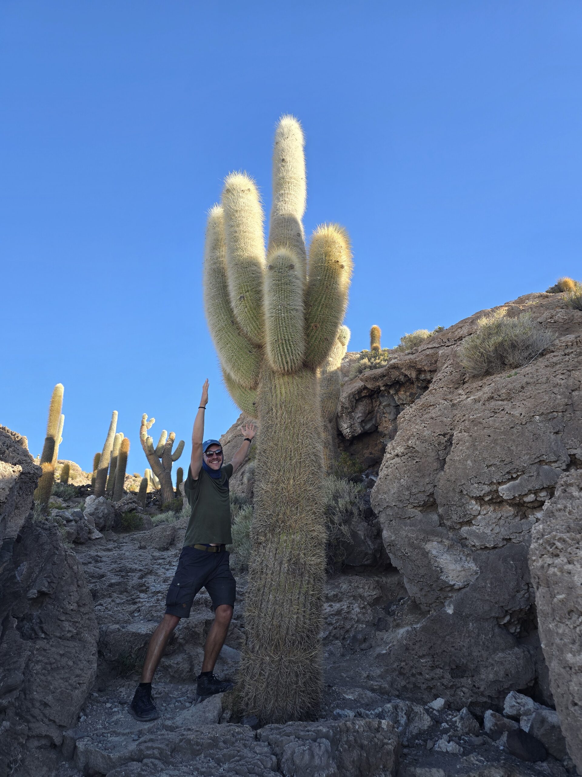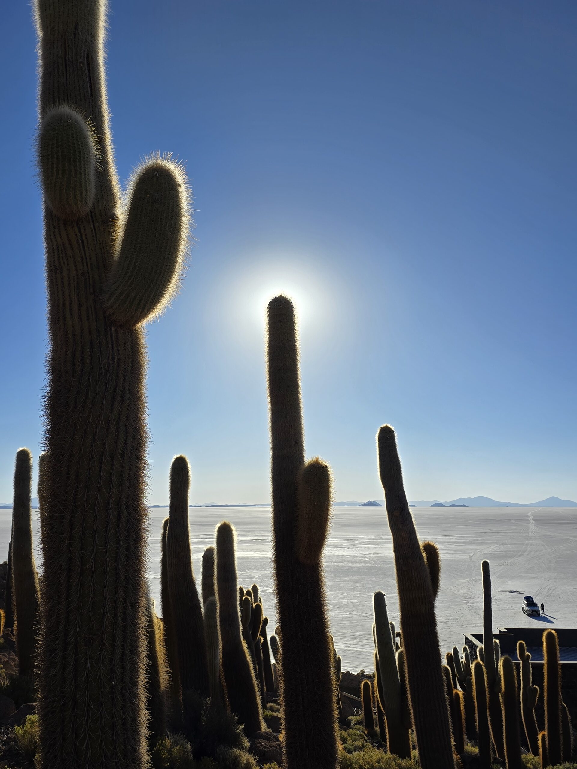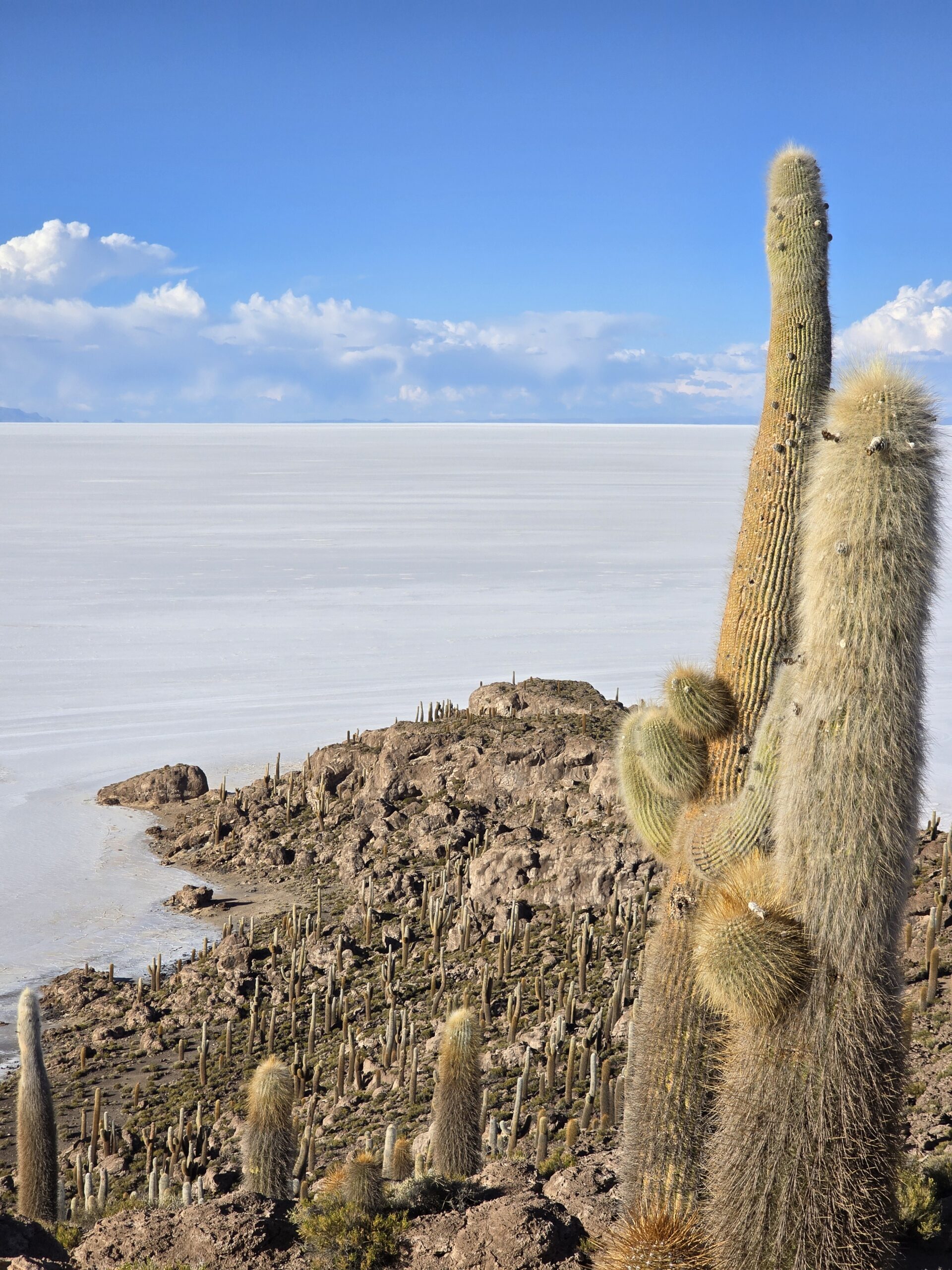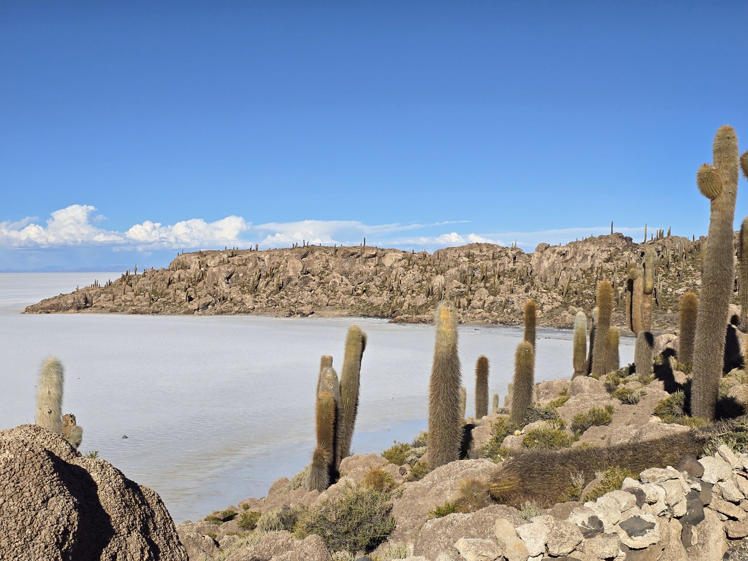 Dass so es so wenig geregnet hat, hatte aber auch Vorteile, denn normalerweise kann man die Insel, die wir nun besuchten in der Regenzeit nicht besuchen. Es ist wirklich faszinierend, nach und nach taucht ein Felsen in der Ferne auf. Zunächst scheint er über dem Meer als Salz zu schweben, bis man näher kommt. Die Insel ist voll mit riesigen Kakteen, die wohl nur ein Zentimeter pro Jahr wachsen. Da könnt ihr euch ja mal selber ausrechnen wie alt die sein müssen!