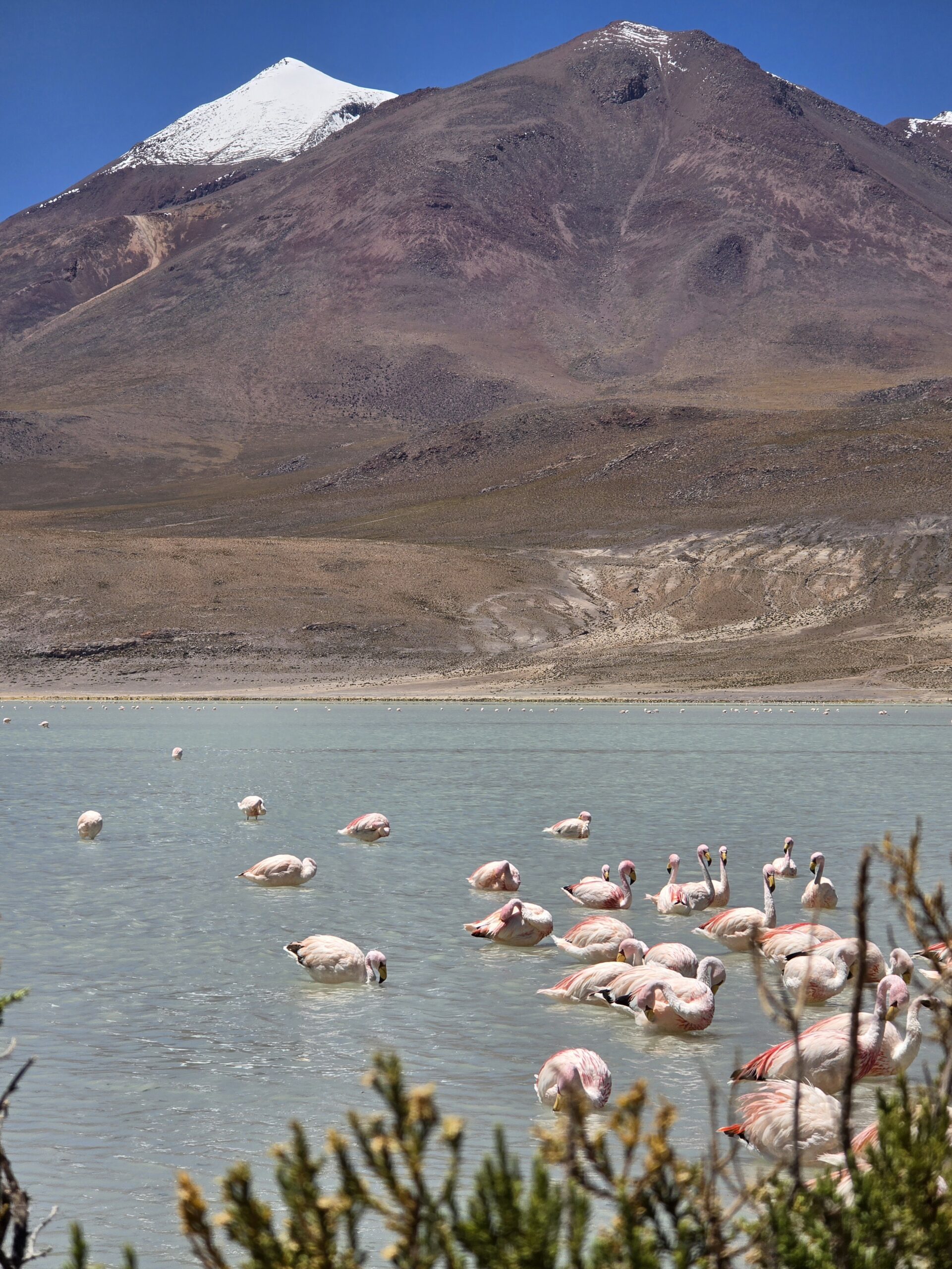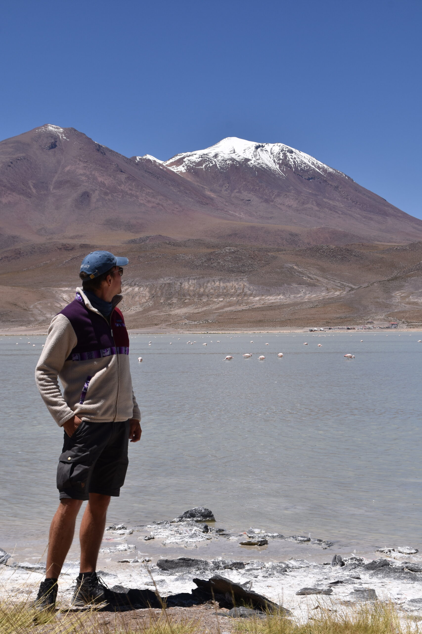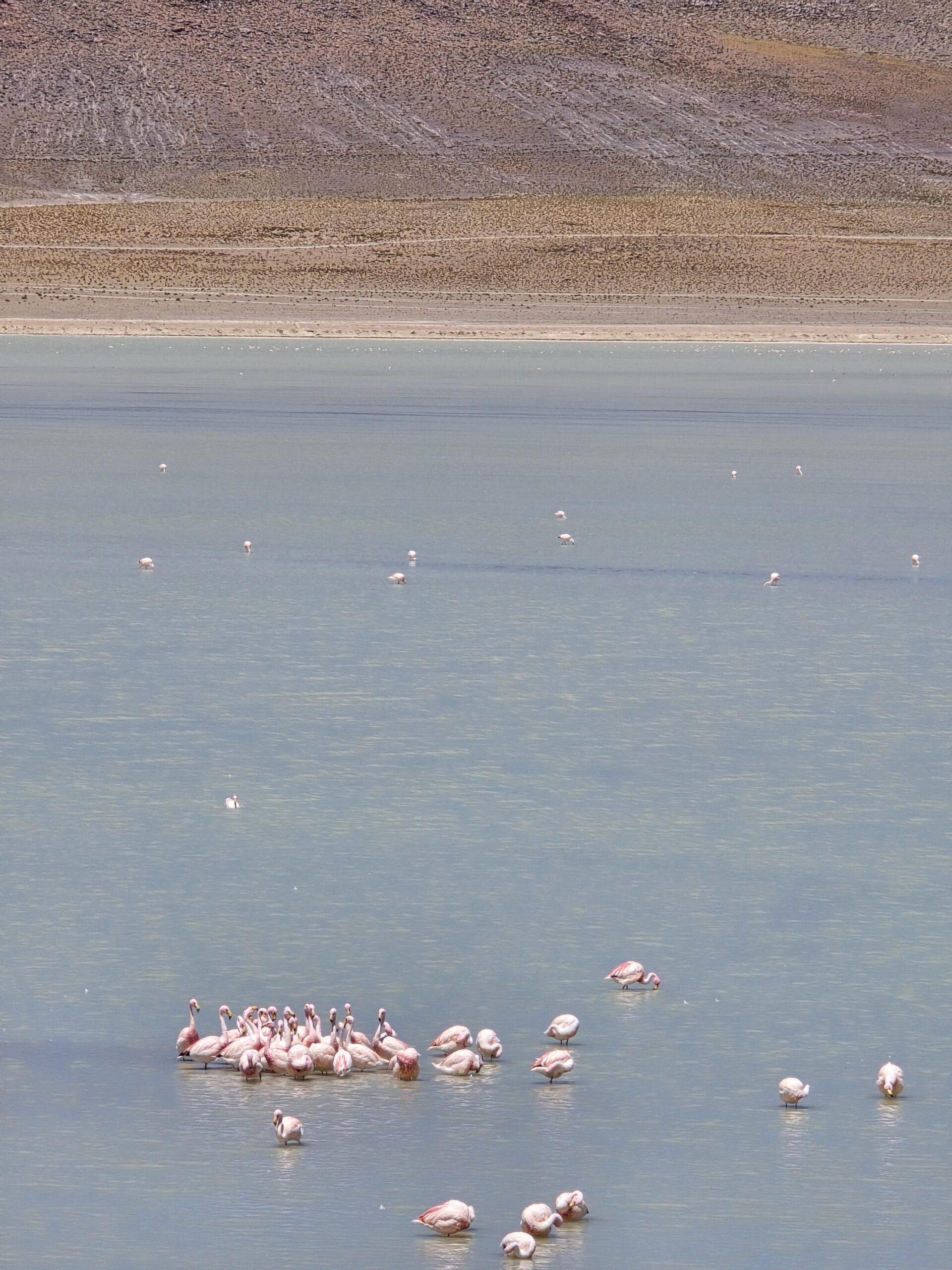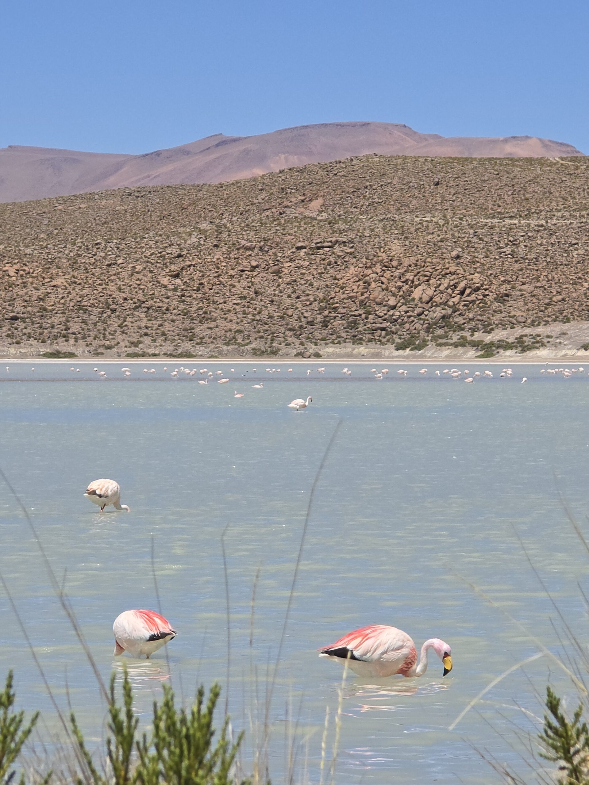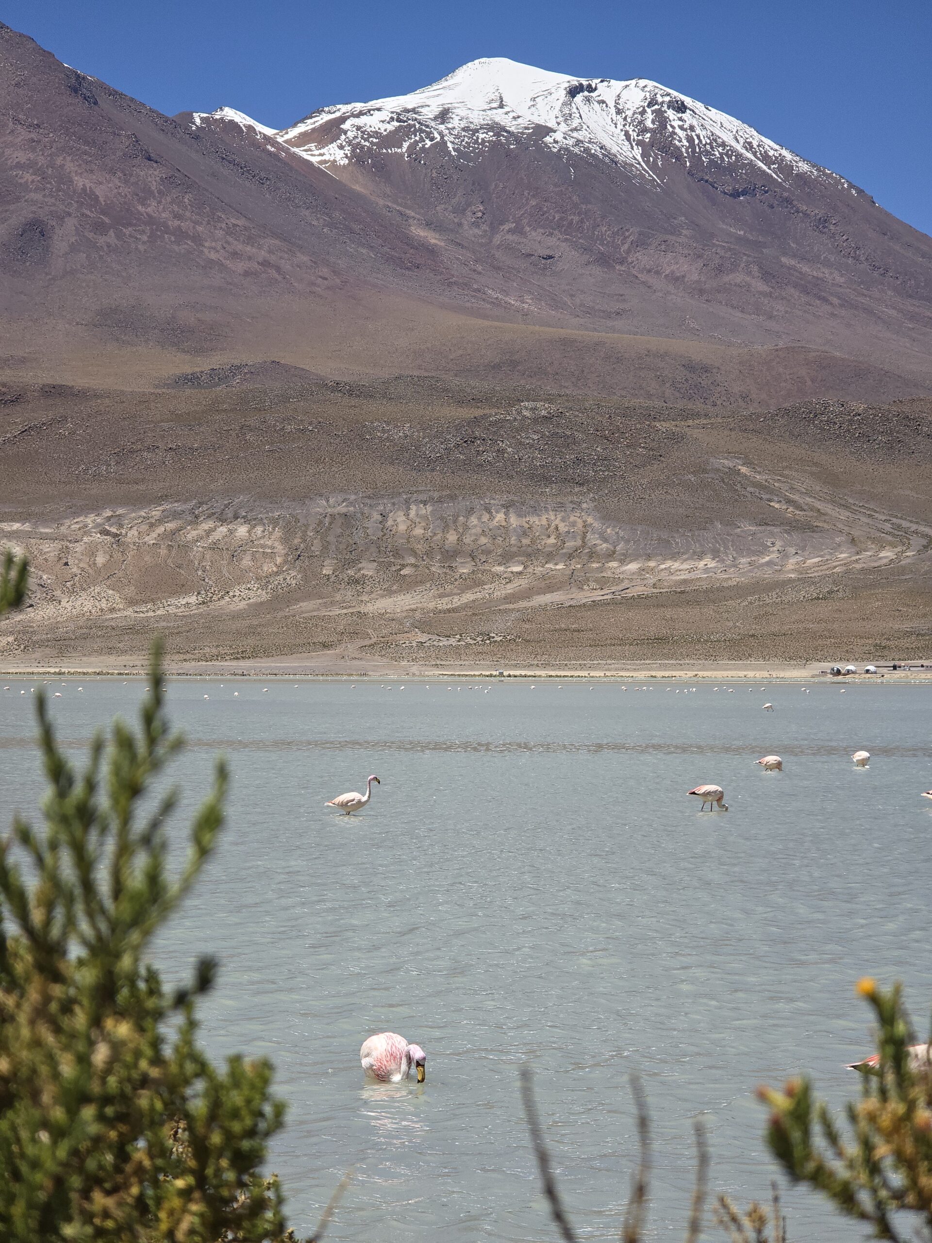 Danach ging es weiter zu den Lagunen, an der ersten waren nur ein paar Flamingos zu sehen. An der zweiten dafür Tausende! Die Flamingos leben das ganze Jahr hier und Migrieren nur zwischen Chile und Bolivien hin und her. Nachdem wir die Vögel ein bisschen bewundert und Fotos gemacht hatten, ging es zum Mittagessen mit Ausblick über die Lagune.