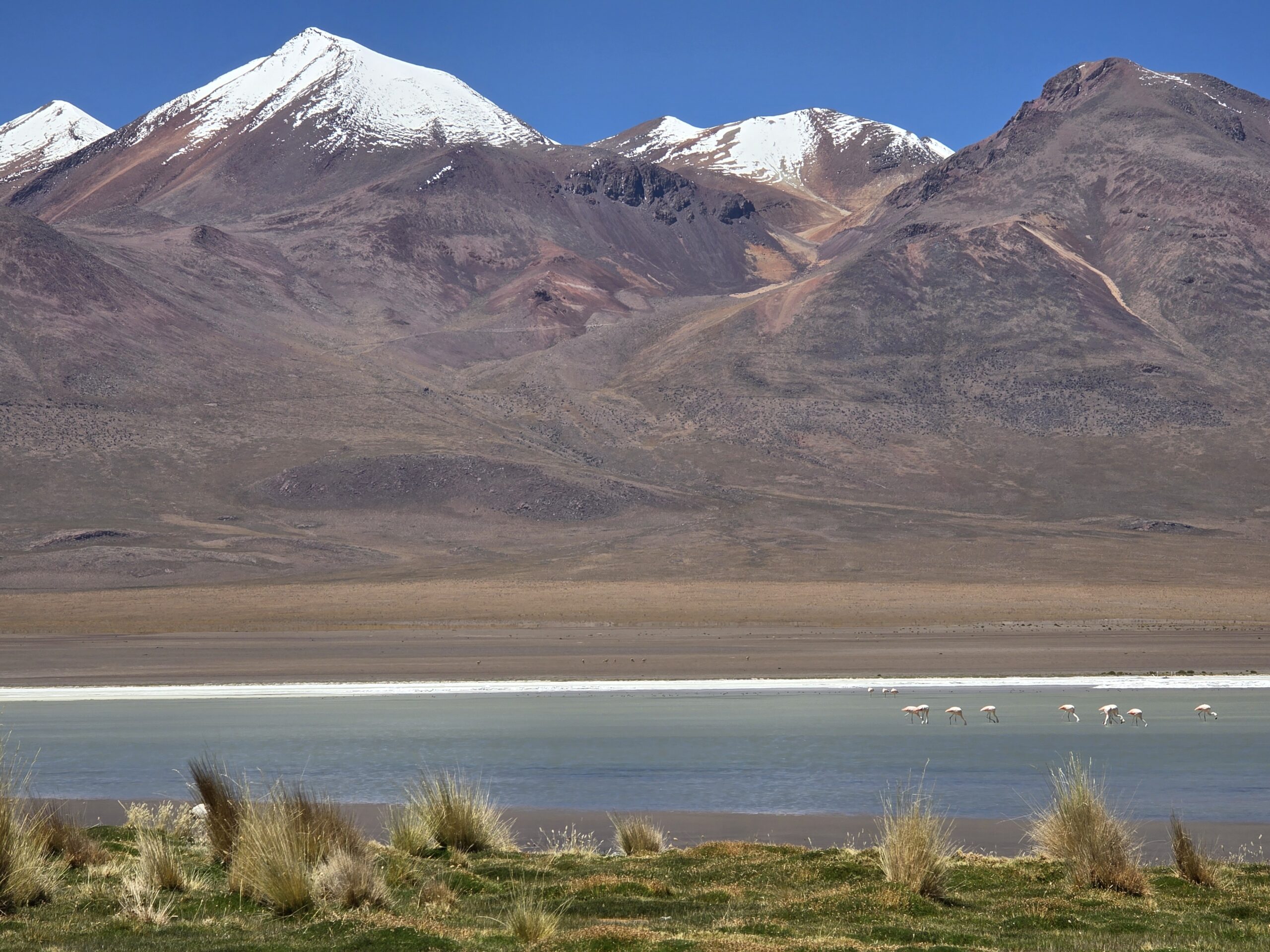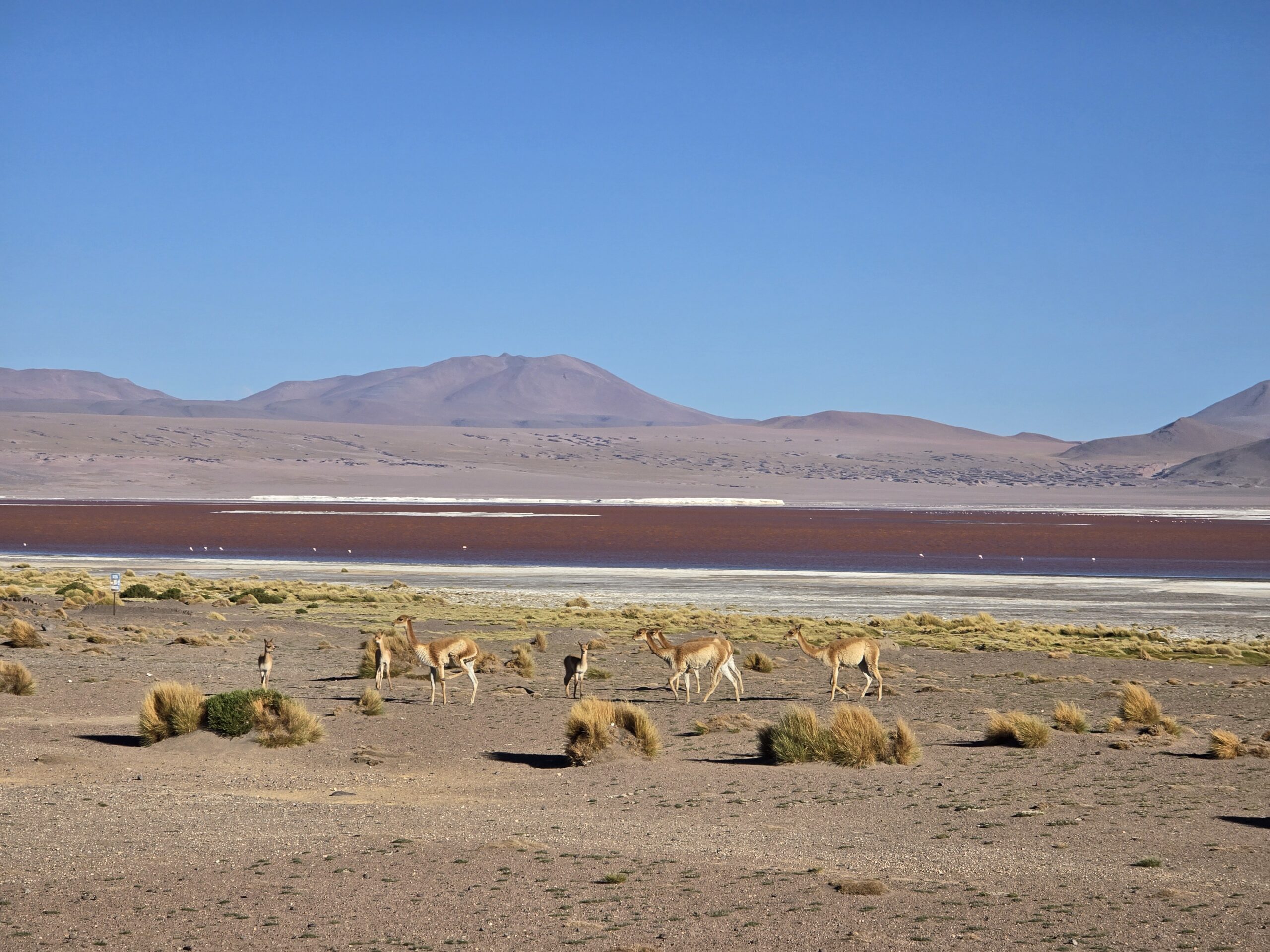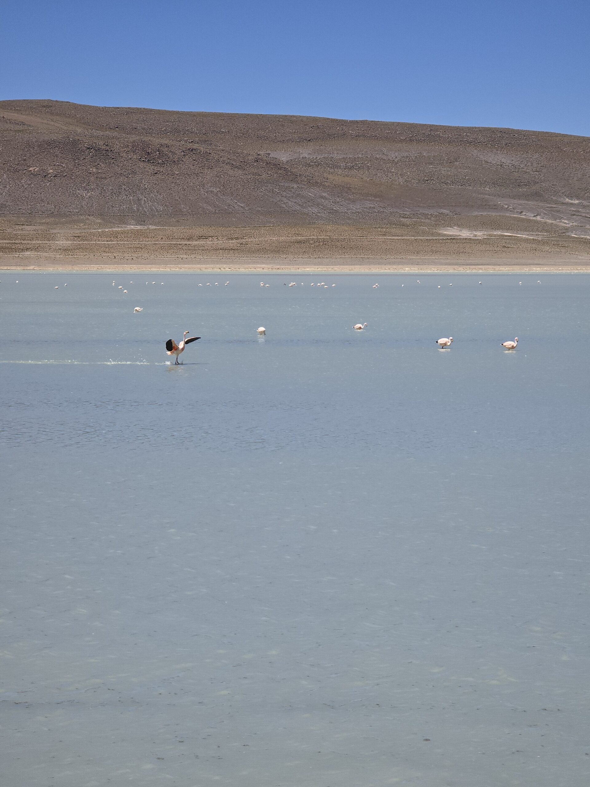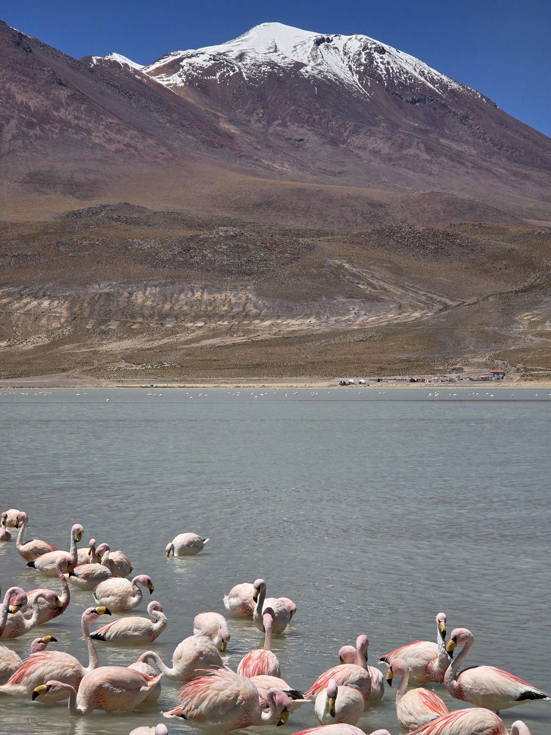 Danach ging es weiter zu den Lagunen, an der ersten waren nur ein paar Flamingos zu sehen. An der zweiten dafür Tausende! Die Flamingos leben das ganze Jahr hier und Migrieren nur zwischen Chile und Bolivien hin und her. Nachdem wir die Vögel ein bisschen bewundert und Fotos gemacht hatten, ging es zum Mittagessen mit Ausblick über die Lagune.