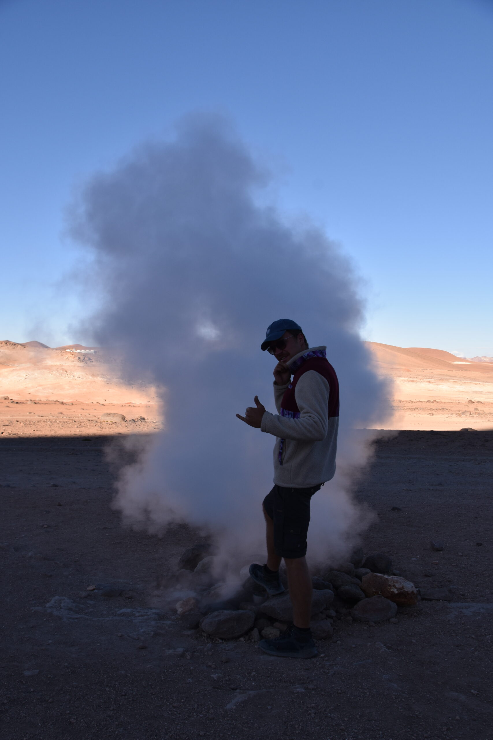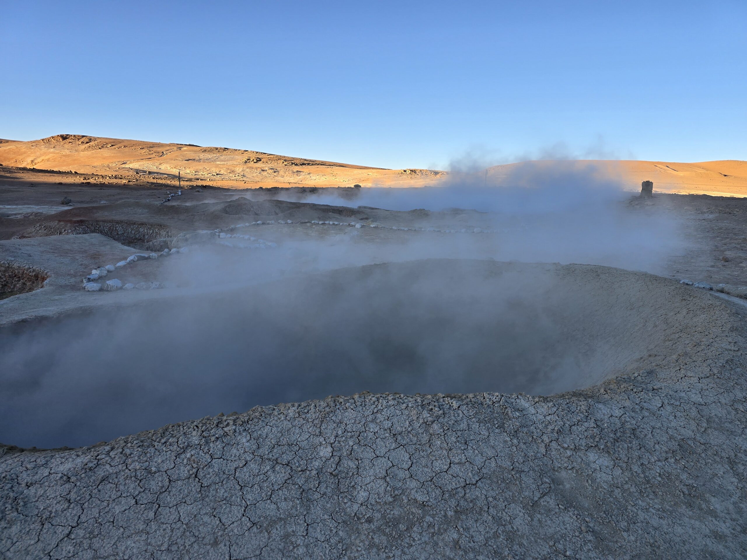 Angekommen mussten wir uns erstmal an die Kälte gewöhnen. Wir waren auf gut 4300m und in der Nacht wird es hier ordentlich kalt. Bis die Sonne aufging war es noch etwas hin, also immer in Bewegung bleiben und nicht zu lange an einem der Geysire stehen bleiben. Es handelt sich bei diesem Geothermalen Feld um das am höchsten gelegene der Welt, 8% der Geysire weltweit sind hier und damit ist es das drittgrößte der Welt. Leider keine die richtig hoch sprühen, aber ordentlich gesprudelt wird dennoch.
