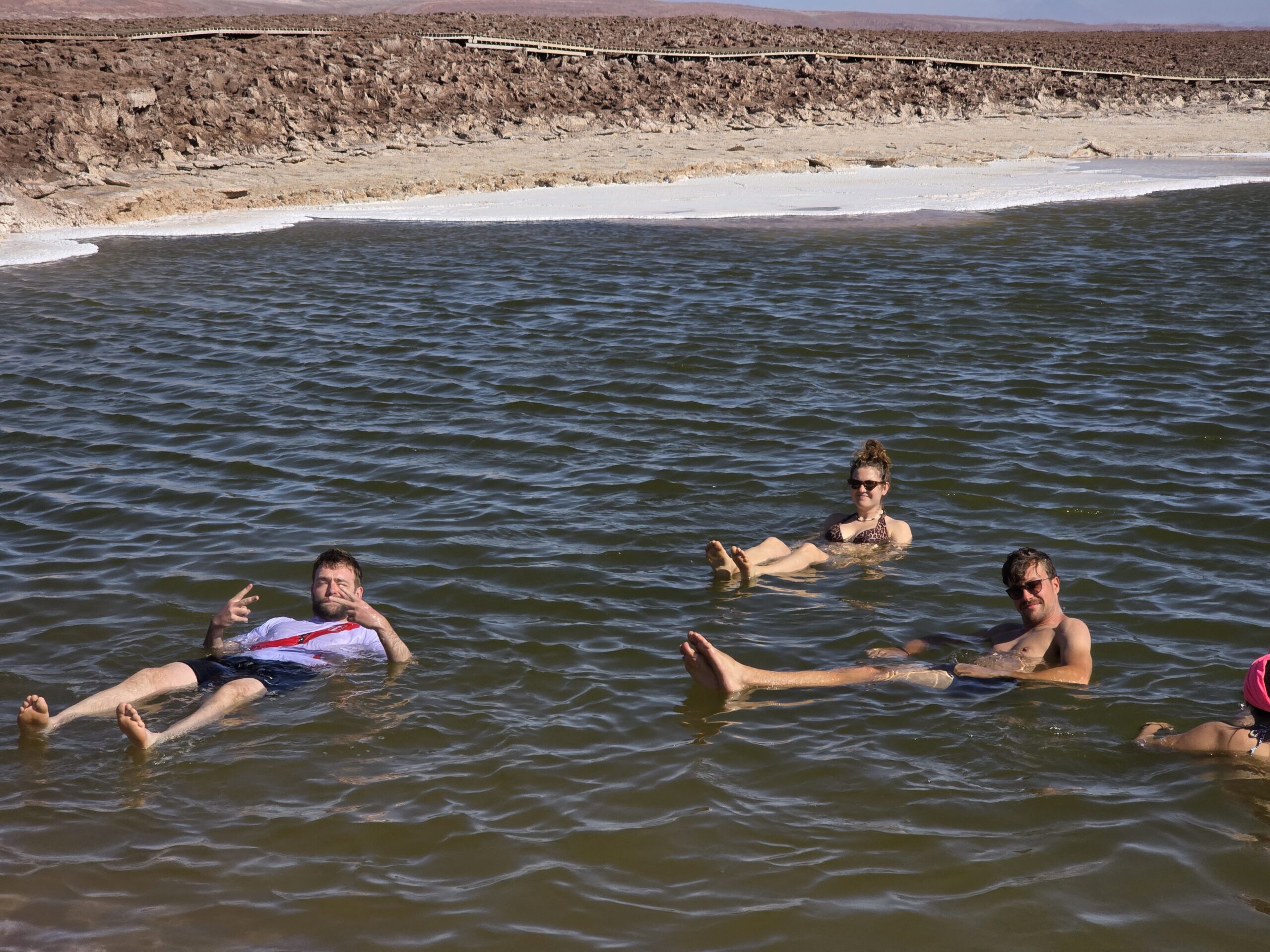Durch dieses Tal fährt man gut 40 Minuten und die Bergketten an den Seiten verändern sich kaum. Diese Dimensionen kann man nur wirklich begreifen, wenn man hier ist und auch dann will es nicht so richtig in den Kopf rein. Die Lagunen, in denen man nicht schwimmen darf, sind klar und das blau ist fast schon unnatürlich. Als schwimmen kann man das auch nicht so richtig bezeichnen, denn jedes Körperteil schwebt und man muss beim Brustschwimmen die Beine aktiv Unterwasser drücken. Der Salzgehalt beträgt immerhin 22%, das ist siebenmal so viel wie im Meerwasser.